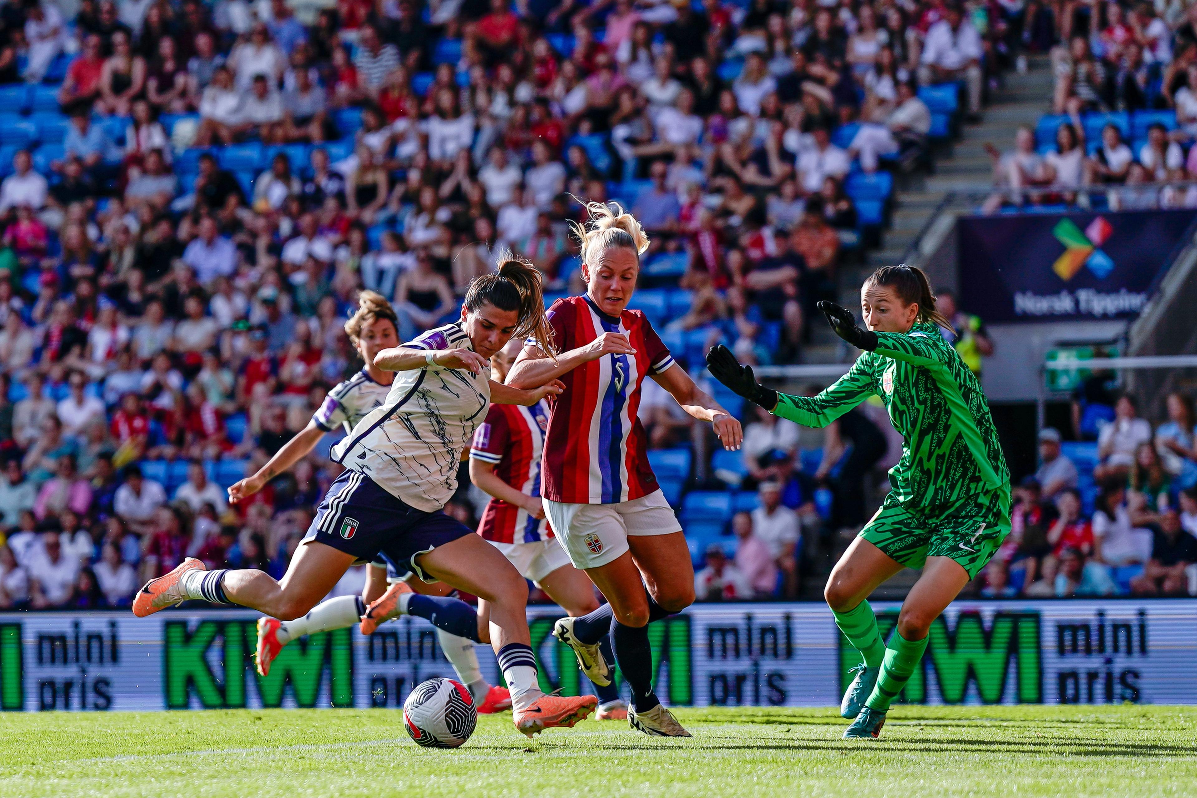 The second half kicked off with Caruso's miracle block, as she slid in to deflect Terland's low shot to deny a certain goal. The game unfolds with continuous end-to-end action, and in the 55', Cantore, perfectly put in by Bonansea, narrowly missed the post with a curling shot from outside the box. Five minutes later, both coaches begin the flurry of substitutions, with Naalsund and Hegerberg coming on for the hosts, while Bonfantini and Dragoni replace the exhausted Bonansea and Greggi. The 17-year-old from Barcelona, in her tenth appearance for the national team, was inspired. On 71', she left a couple of opponents behind and unleashed a rocket that narrowly missed the crossbar.