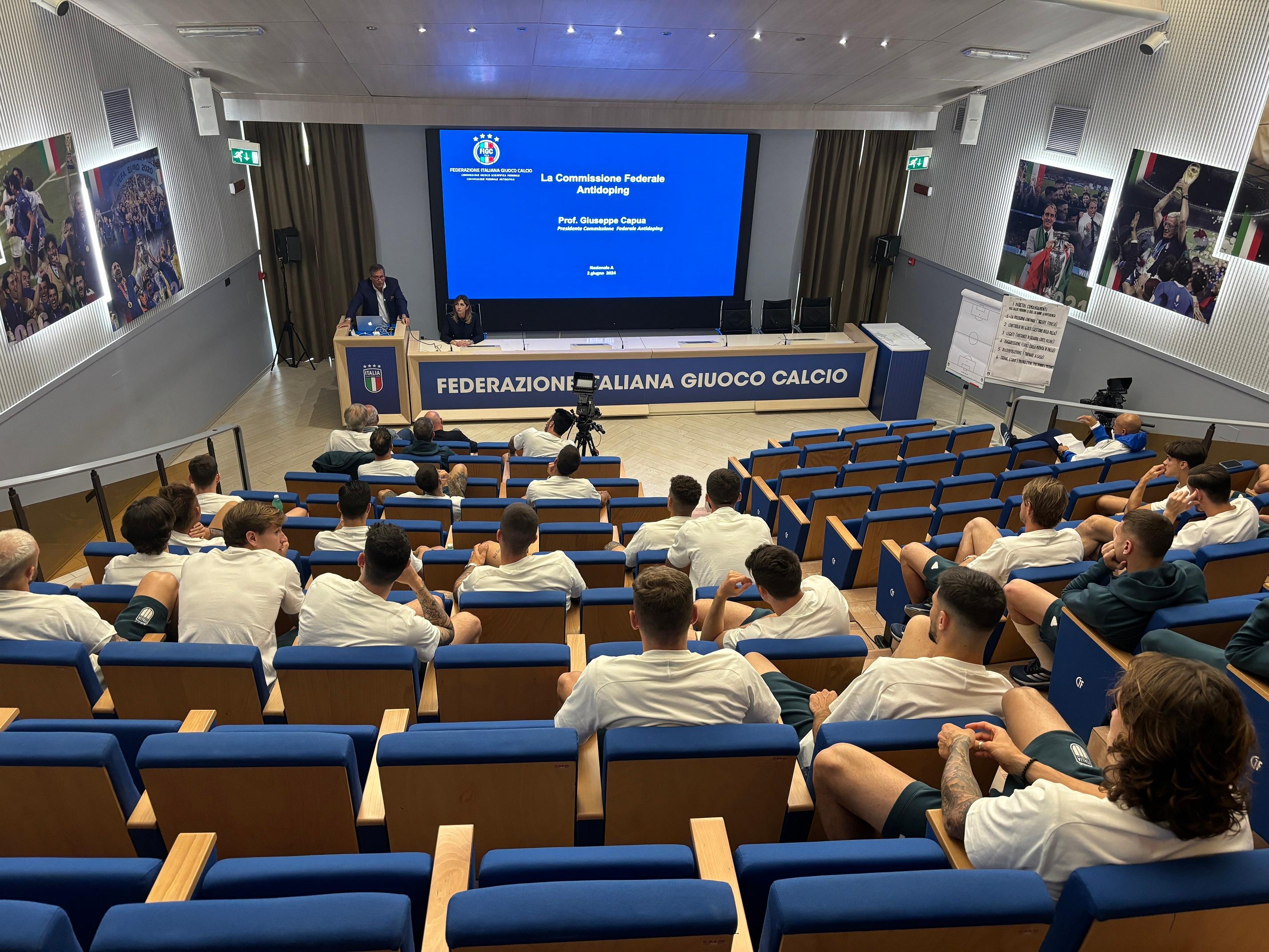 ANTI-DOPING MEETING. After yesterday's meeting on match-fixing, the Azzurri had another encounter this morning as part of UEFA's anti-doping educational program HatTrick V. Professor Giuseppe Capua, (President of the Federal Anti-Doping Commission) and Alessia Di Gianfrancesco (General Director of NADO Italia) met with the players and staff of the National Team in the auditorium of the Federal Technical Center in Coverciano. Among the topics discussed were the prevention of intentional and unintentional doping, anti-doping controls, the list of prohibited substances, and therapeutic use exemption (TUE) requests.