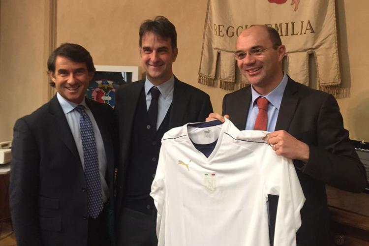 Nelle foto: in home page da destra il Dg della Federcalcio Michele Uva, l’Ad del Sassuolo Giovanni Carnevali, il Sindaco di Reggio Emilia Luca Vecchi, il Project Leader del gruppo di lavoro di EURO 2019 Andrea Stefani e il Responsabile dell’Ufficio Competizioni della FIGC Giovanni Spitaleri. In alto il Dg Uva consegna al Sindaco Vecchi la maglia della Nazionale.