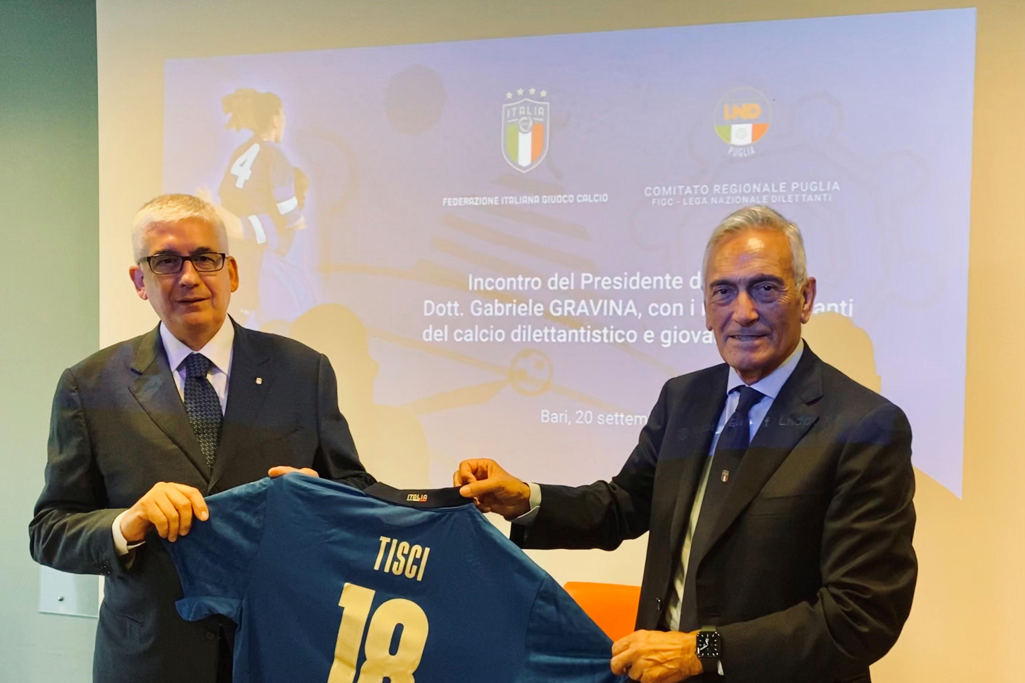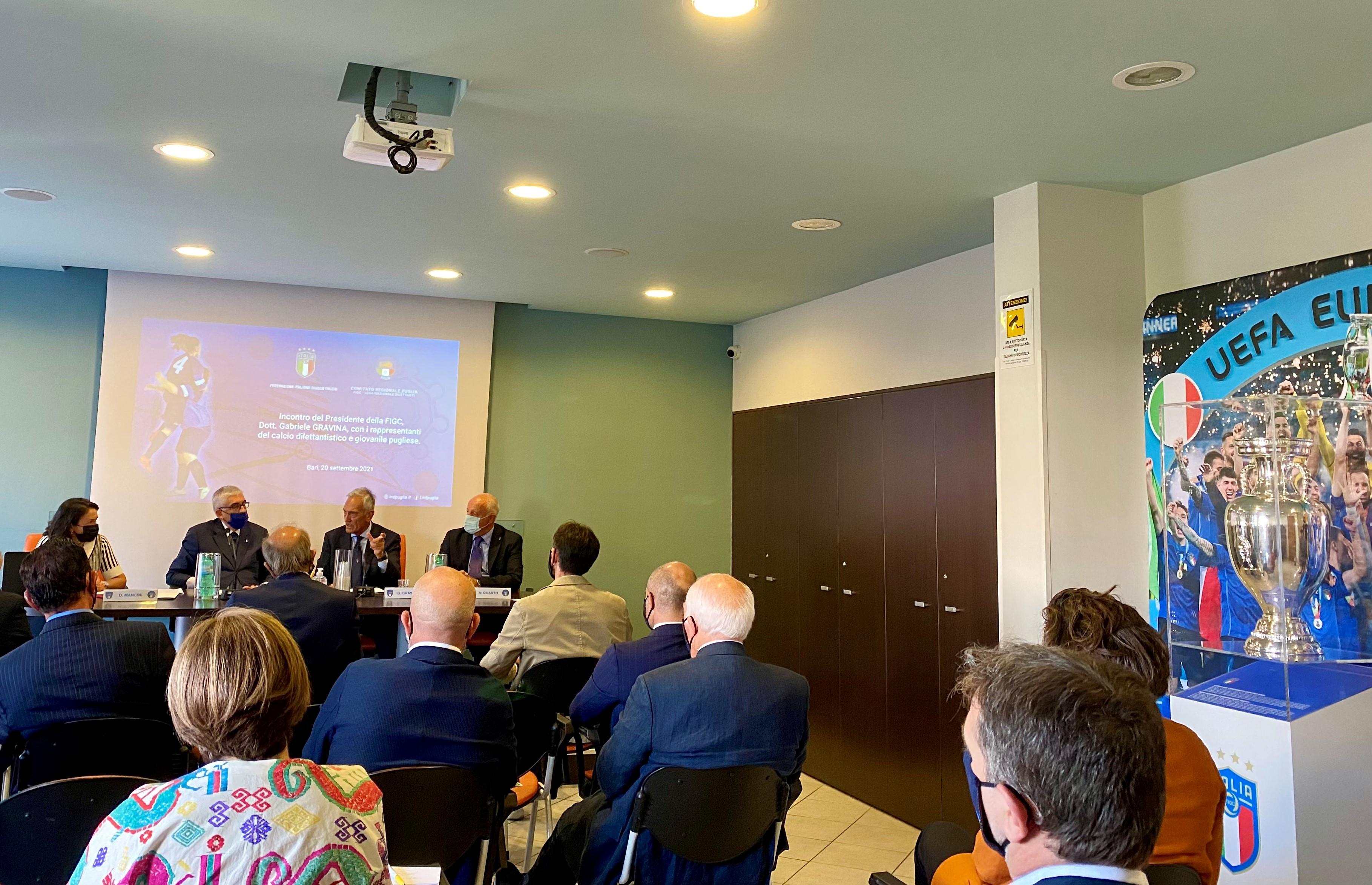 Il tour del presidente della FIGC Gabriele Gravina presso i Comitati Regionali della Lega Nazionale Dilettanti e nei coordinamenti del Settore Giovanile e Scolastico fa tappa a Bari. Il dialogo con i rappresentanti territoriali del calcio italiano prosegue senza sosta, ascoltando, da un lato, esigenze e preoccupazioni sullo stato di salute del movimento dilettantistico e giovanile, e ricevendo, dall’altro, suggerimenti e proposte per il futuro. Prima di confrontarsi con i consiglieri regionali, i delegati provinciali e quelli assembleari del Comitato pugliese, insieme al numero uno del calcio regionale Vito Tisci, Gravina ha incontrato il governatore Michele Emiliano e il sindaco di Bari Antonio Decaro.