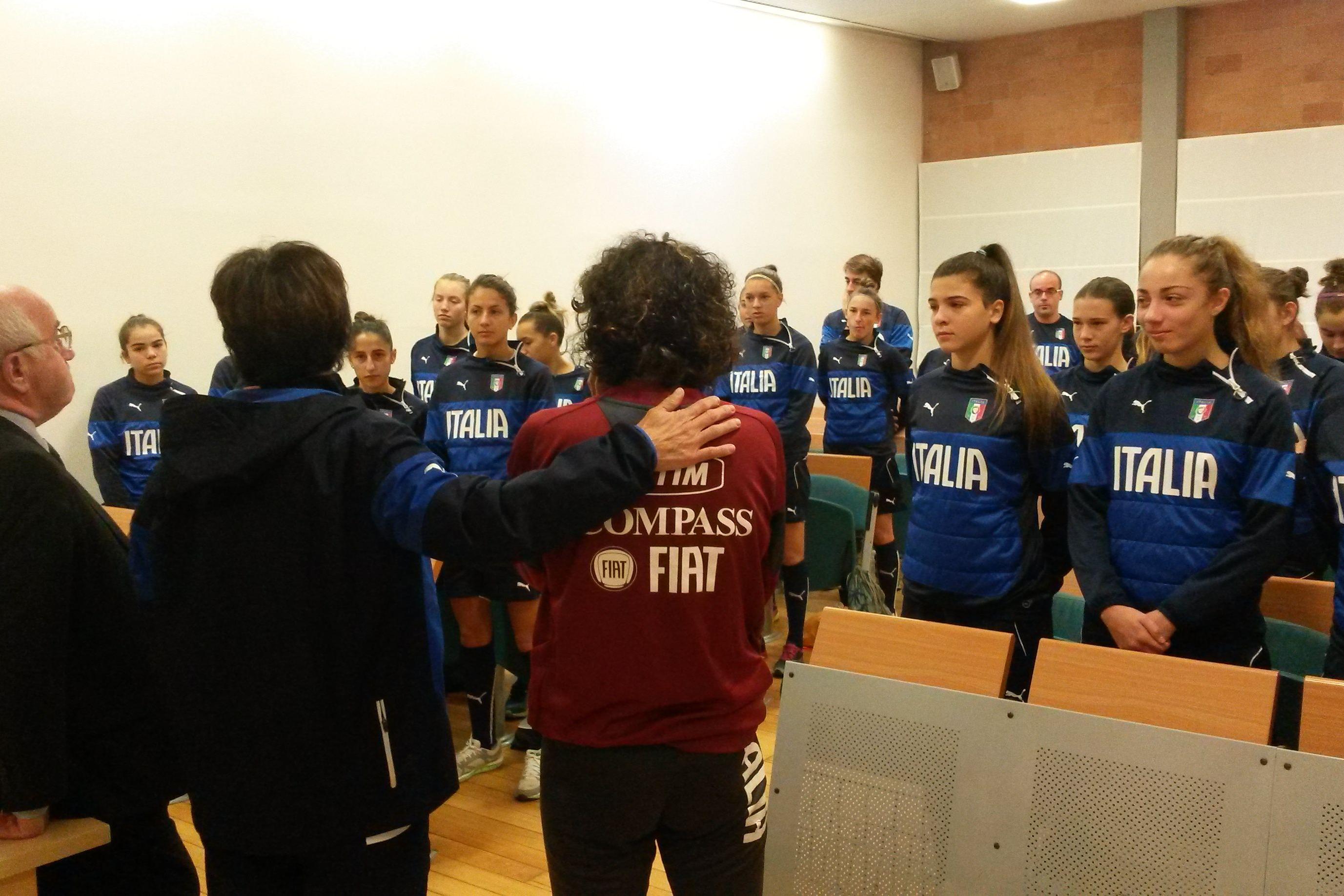 Si conclude oggi lo stage di preparazione della Nazionale Femminile Under 17 alla seconda fase del Campionato Europeo, in programma a marzo, che si è svolto in questi giorni presso il C.P.O. Acqua Acetosa. Le ventitré Azzurrine a disposizione del tecnico Rita Guarino hanno ricevuto in mattinata la visita del presidente Tavecchio che, alla presenza del capo delegazione Manuela Di Centa e del tecnico federale, si è intrattenuto con la squadra. “È con molto piacere – ha detto il presidente rivolgendosi alle calciatrici azzurre - che vi porto il saluto di tutta la Federazione: siete un esempio per impegno in campo e nello studio, siamo orgogliosi di voi. La FIGC crede molto nel calcio femminile, stiamo investendo in progettualità e risorse e, grazie al traino delle Nazionali, crescerà tutto il movimento”.