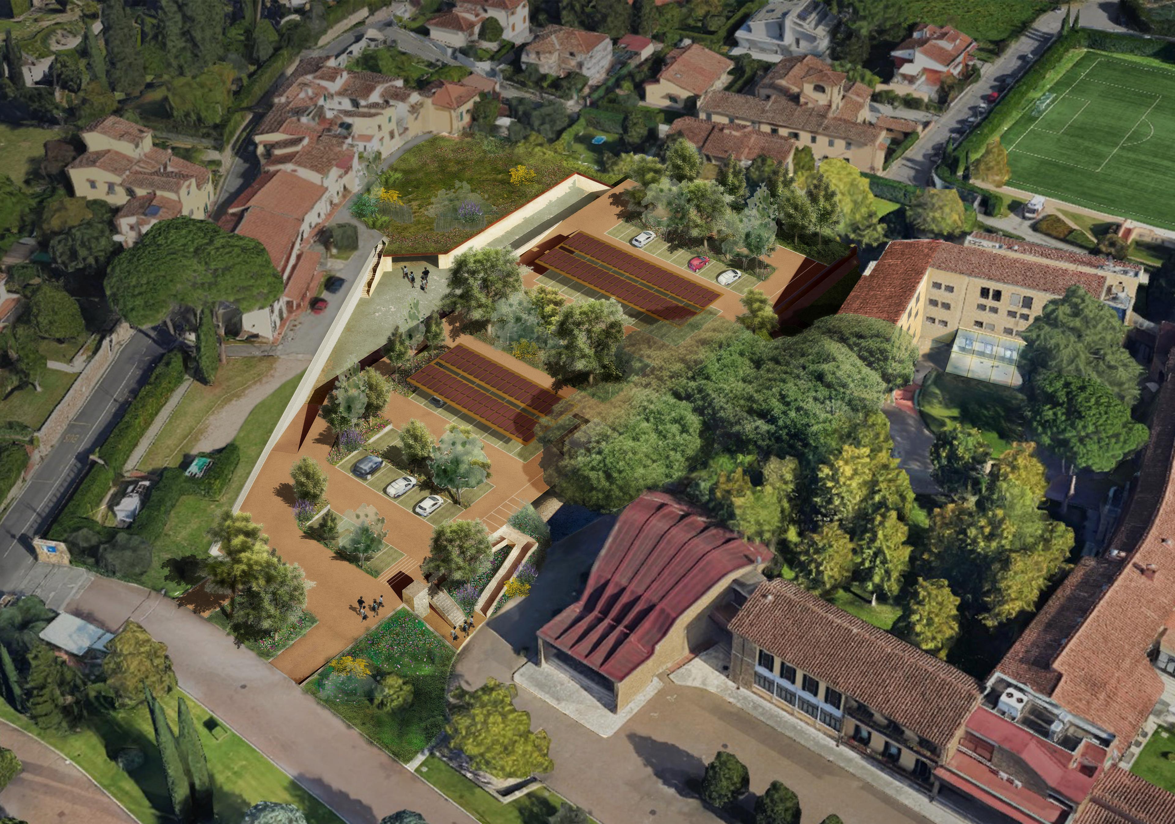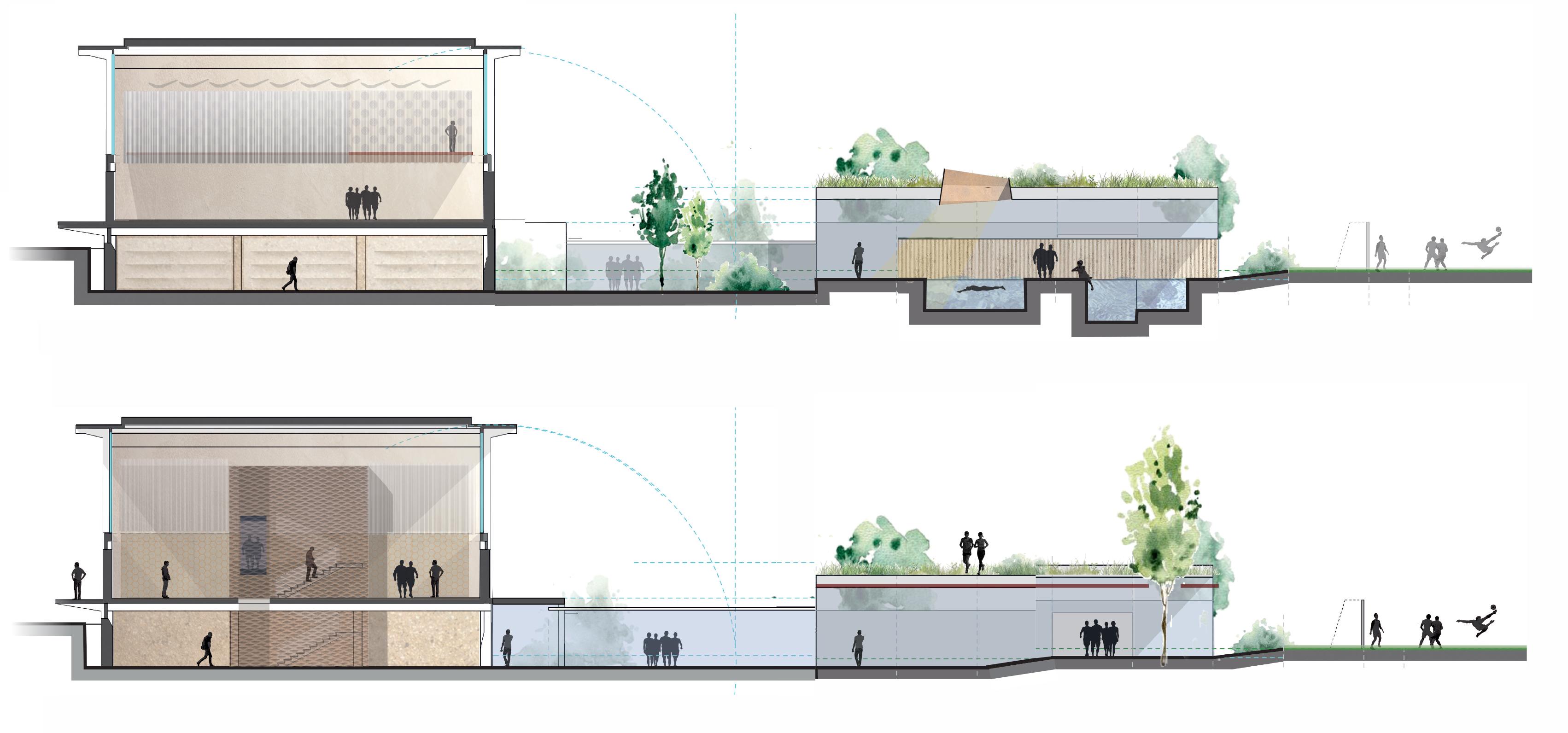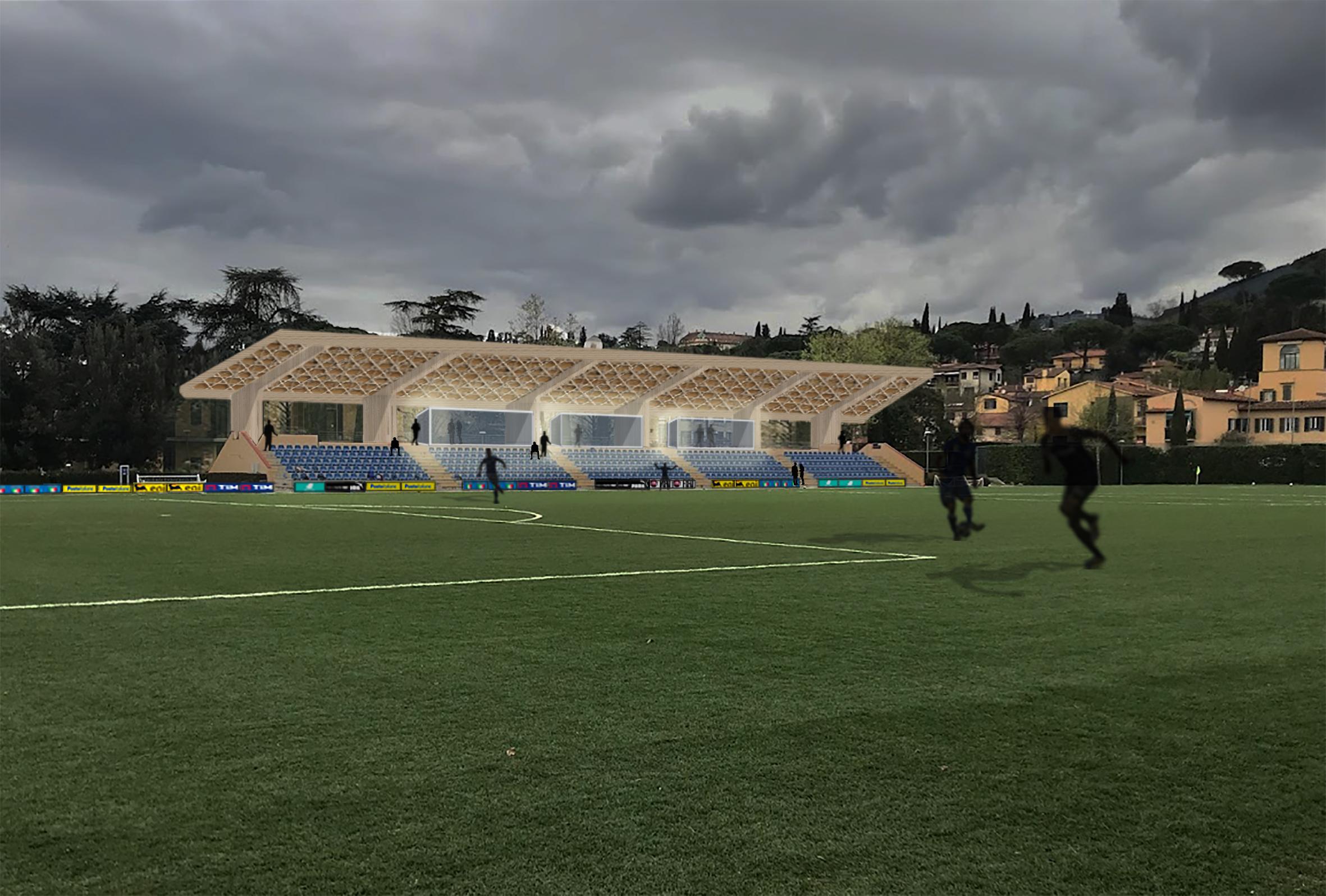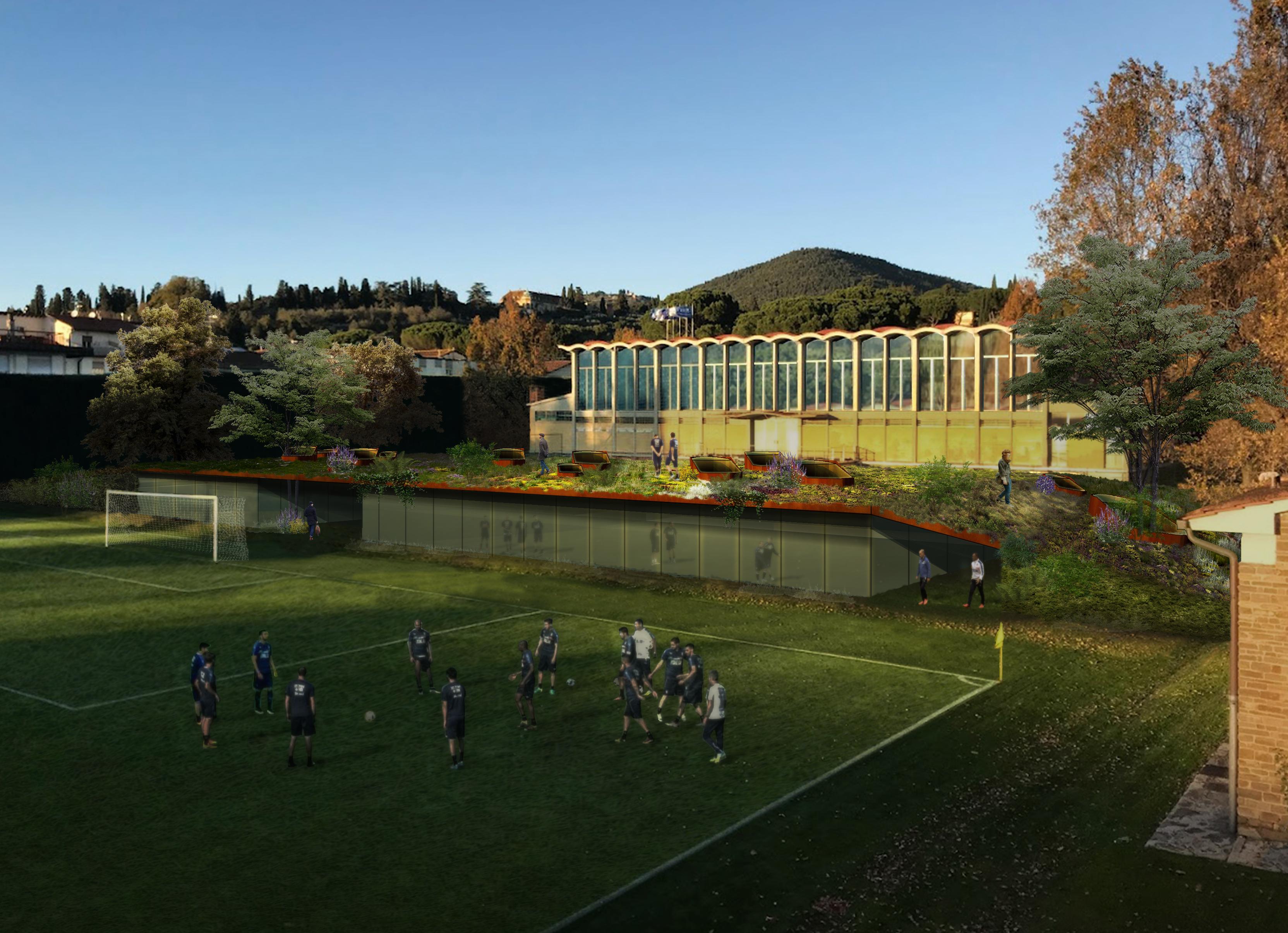 La struttura avrà poi un accesso diretto ai campi principali (n.3 e n.4), con una copertura verde, praticabile, che si inserisce nello scenario delle colline fiorentine. In questo edificio, inoltre, saranno ospitati, nei livelli superiori, gli spazi destinati alle riunioni tecniche, al lavoro dello staff tecnico e delle diverse unità a supporto delle squadre, gli studi TV, le Sale Conferenze e l’area di lavoro per i Media al seguito degli Azzurri e delle Azzurre.