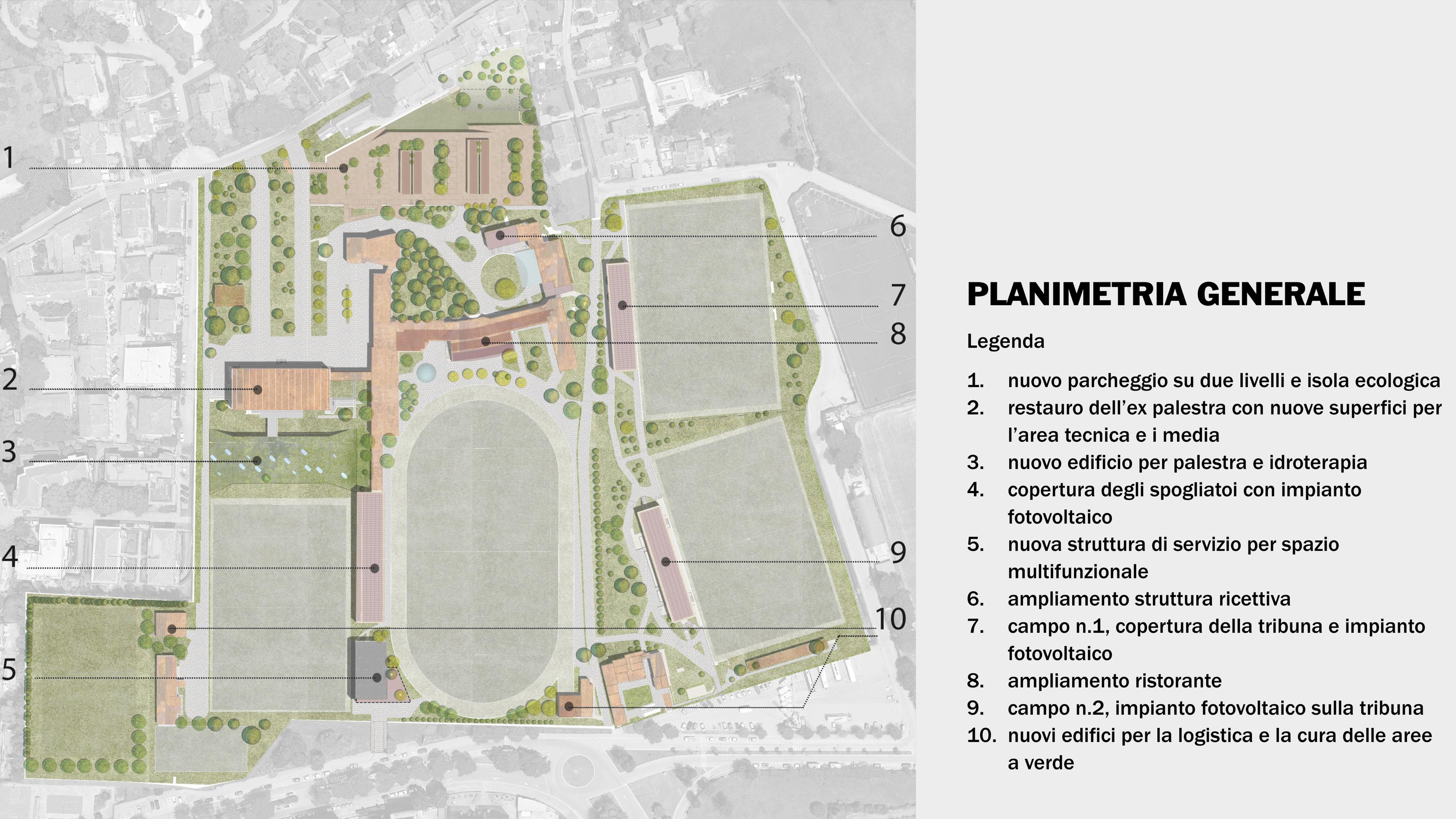 Considerando le linee guida UEFA sulla sostenibilità delle infrastrutture sportive e sulla costruzione e gestione dei centri di allenamento ("Best Practice Guide to Training Centre Construction and Management" e "Sustainable Infrastructure Guidelines"), una delle componenti strategiche del piano di ristrutturazione è l’autosufficienza energetica, grazie a un impianto fotovoltaico di elevata produttività (superficie totale di 3.180m2, produzione a regime di circa 900.000 KWh annui), inserito nel contesto paesaggistico e urbano.