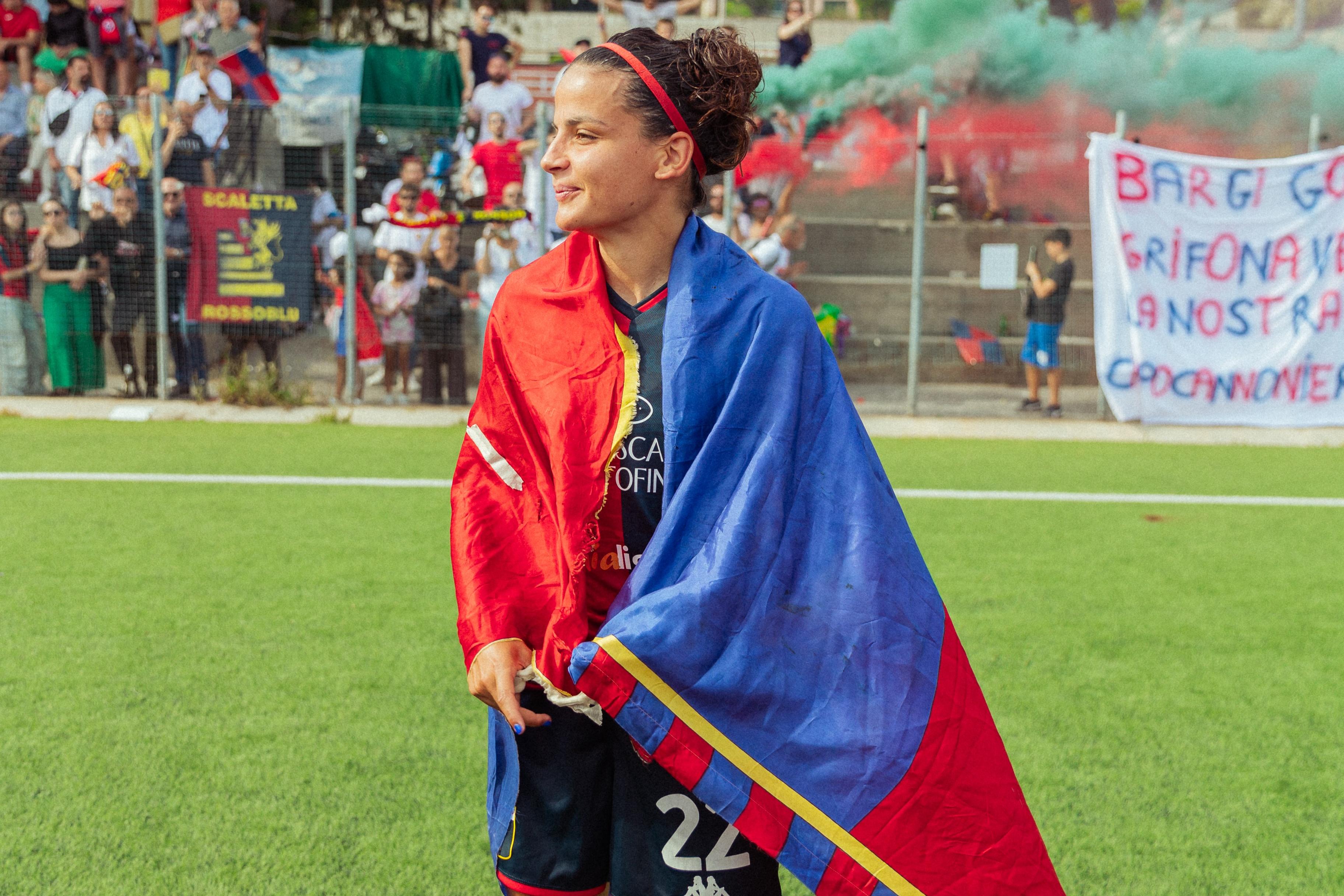 Caterina Bargi potrebbe scendere in campo con la sciarpa. Una tifosa in campo, una calciatrice in curva, perché succede davvero. Quello tra 'Cate' e il Genoa è il perfetto 'Guasto d'Amore' descritto nella canzone di Bresh diventata la colonna sonora del Ferraris. Quello che 'mi vibra la pancia e mi trema la voce'. La percezione, ascoltando le parole nata nel giorno di Natale del 1995 - che domenica scorsa ha segnato quattro gol nell'8-0 delle rossoblù sul Pavia - è quella di trovarsi di fronte una persona che dalla vita ha veramente ricevuto il regalo più bello.