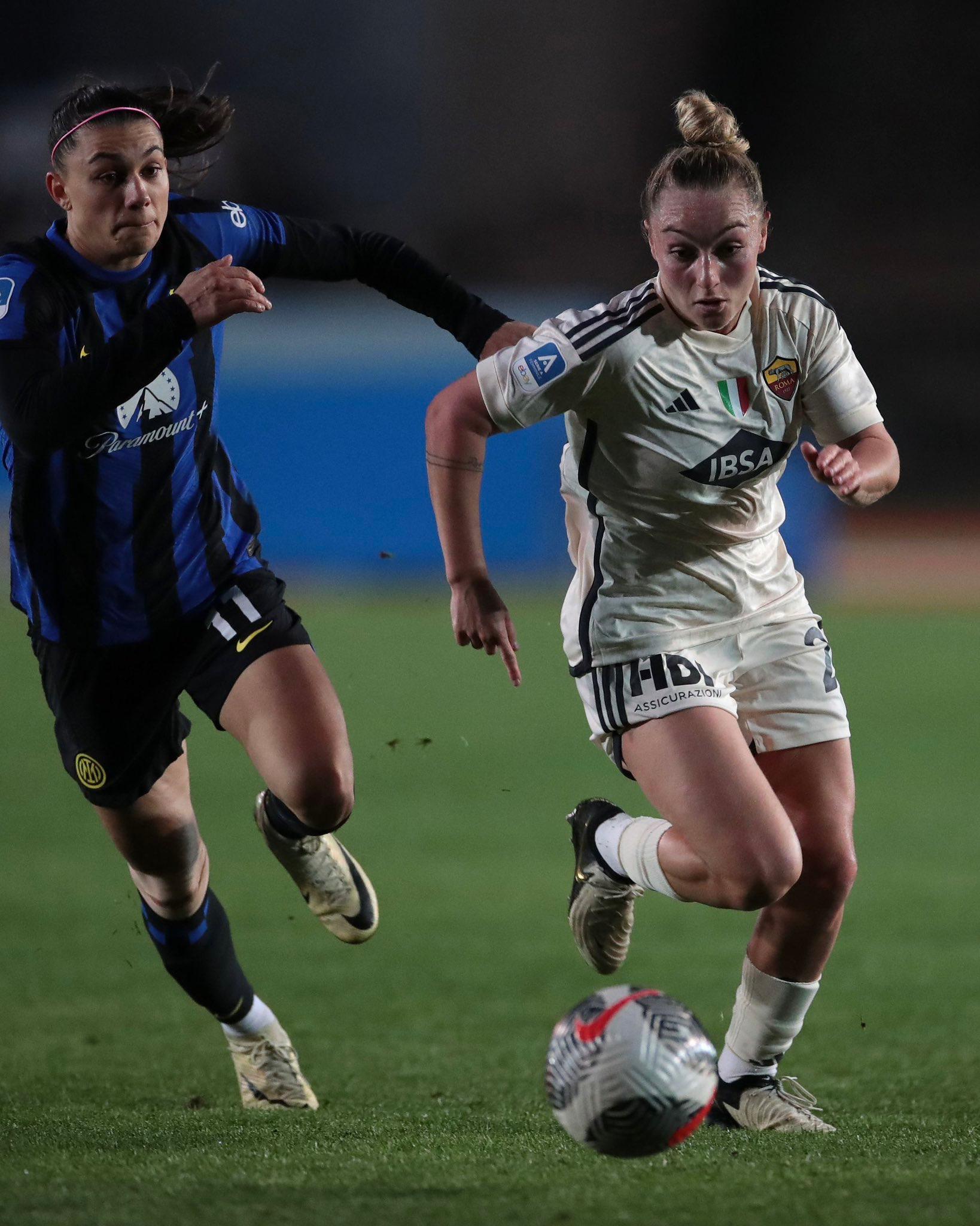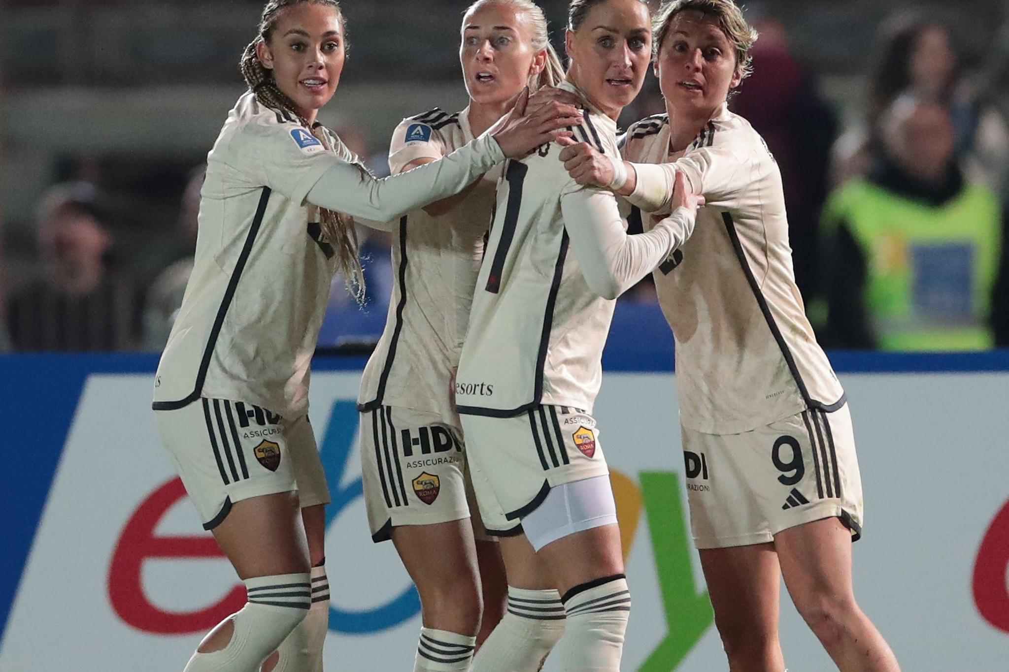 A inizio ripresa infatti il primo brivido è per la Roma, che sugli sviluppi di un calcio d’angolo per le nerazzurre rischia l’autogol con Minami. I segnali sono chiari e l’insistenza della squadra di Guarino alla fine viene premiata: dopo aver fallito un’altra grande occasione (miracolo di Ceasar sull’ex Serturini e successivo controllo errato di Cambiaghi) la rete dell’1-1 la trova. Al 60’, in momentanea inferiorità numerica per un problema a Serturini, grande strappo di Cambiaghi dopo un duello aereo vinto con Minami, cross rasoterra della numero 36 e deviazione in porta dell’altra ex Bonfantini, che firma il suo sesto gol in Serie A in maglia nerazzurra. Il pareggio raggiunto galvanizza Csiszar e compagne, che dopo tre minuti vanno vicinissime al sorpasso: triangolazione efficace sulla trequarti con Polli che alla fine smarca Magull davanti a Ceasar; la tedesca tenta un esterno al volo per sorprendere l’estremo difensore rumeno e il pallone termina fuori di pochissimo. Nell’ultima mezz’ora di gara la Roma prova a guadagnare nuovamente metri e a farsi vedere di più in chiave offensiva, ma né l’una né l’altra squadra sembrano avere la forza per l’affondo decisivo. Almeno fino all’89’, quando la subentrata Troelsgaard calcia il pallone da distanza siderale e – complice una deviazione di Bowen – beffa Cetinja. Finisce 2-1 per le prime della classe la sfida dell’Arena, contro un’Inter meno cinica e anche poco fortunata. Sabato in programma la seconda gara di Poule Scudetto tra Juventus e Fiorentina, oltre alle due di Poule Salvezza Napoli-Sampdoria e Como-Milan.