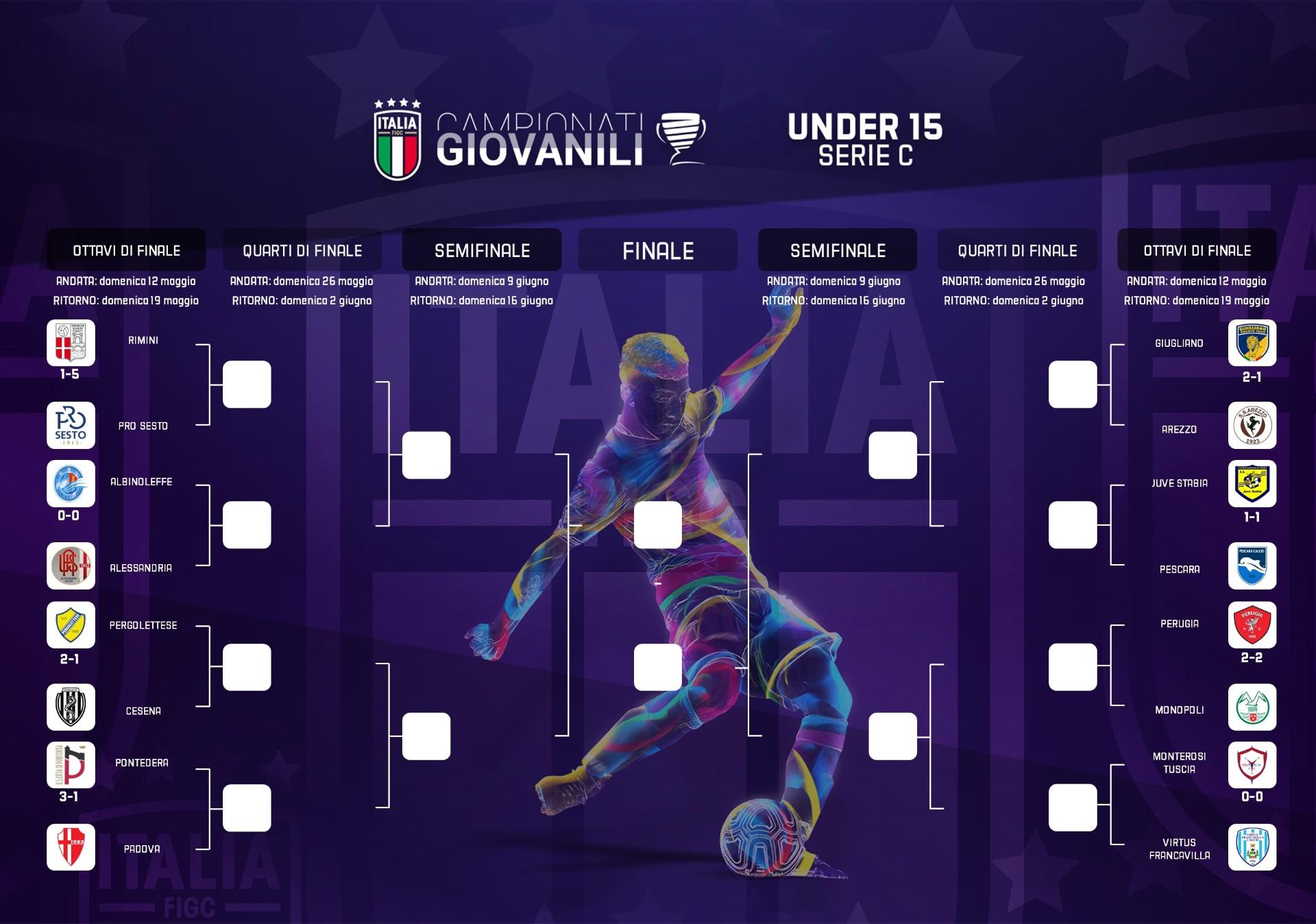 Grande avvio negli ottavi di finale del campionato Under 15 per la Pro Sesto, che stravince al 'Musiani' di Rimini, superando i padroni di casa per 5-1 (marcatori: Finocchioli, Menotti, doppietta di Ponzo e un'autorete per i lombardi; Odino per i biancorossi). Ottima prova anche per il Pontedera, che tra le mura amiche del 'Maroncini', si impone per 3-1 sul Padova dei 100 gol in stagione, grazie alle reti di Simonti, De Francesco e Gallucci (per il Padova a segno Rizzo), e per la Pergolettese, che si aggiudica la sfida contro i Campioni d'Italia del Cesena, vincendo per 2-1 (marcatori: Moretti e Facchi per la formazione di Crema; Favale per i romagnoli). Napolitano e Casanova, rispondono a Postiglione e regalano al Giugliano il successo nella gara d'andata contro l'Arezzo (2-1), mentre l'altra squadra campana approdata alla fase a eliminazione diretta, la Juve Stabia, pareggia in casa con il Pescara per 1-1 dopo le reti di Sparavigna e Arena. Buon risultato del Monopoli al 'Centro Sportivo Paolo Rossi' di Perugia: un pareggio per 2-2 maturato grazie ai gol di Maggiulli e Ranieri per i pugliesi e Bendini e Castroreale per gli umbri. Terminate invece 0-0 sia Monterosi-Virtus Francavilla che Albinoleffe-Alessandria.