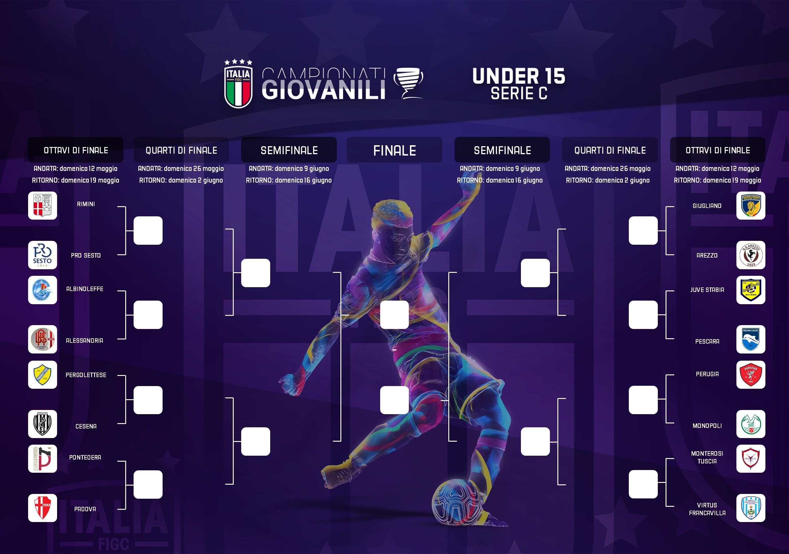 Nell'ultima giornata, Pontedera e Pergolettese hanno festeggiato la qualificazione agli ottavi di finale del campionato Under 15 di Serie C. I toscani, grazie all'1-1 casalingo con la Pro Vercelli (alla rete granata di Pjetri ha risposto il bianco Grandi), hanno chiuso il girone A al 3° posto con 50 punti insieme alla Pergolettese che, pur vincendo 4-0 in casa con la Torres (doppiette di Clerici e Picarelli), ha concluso con gli stessi punti dei toscani ma con gli scontri diretti a sfavore (Pontedera-Pergolettese 3-1 del 10 dicembre e Pergolettese-Pontedera 1-3 del 14 aprile) mantenendo a distanza di un punto la Virtus Entella, che ha vinto 5-2 in trasferta con il Novara (a segno per i biancocelesti Bellomo, Badini, Forte e doppietta di Renna).