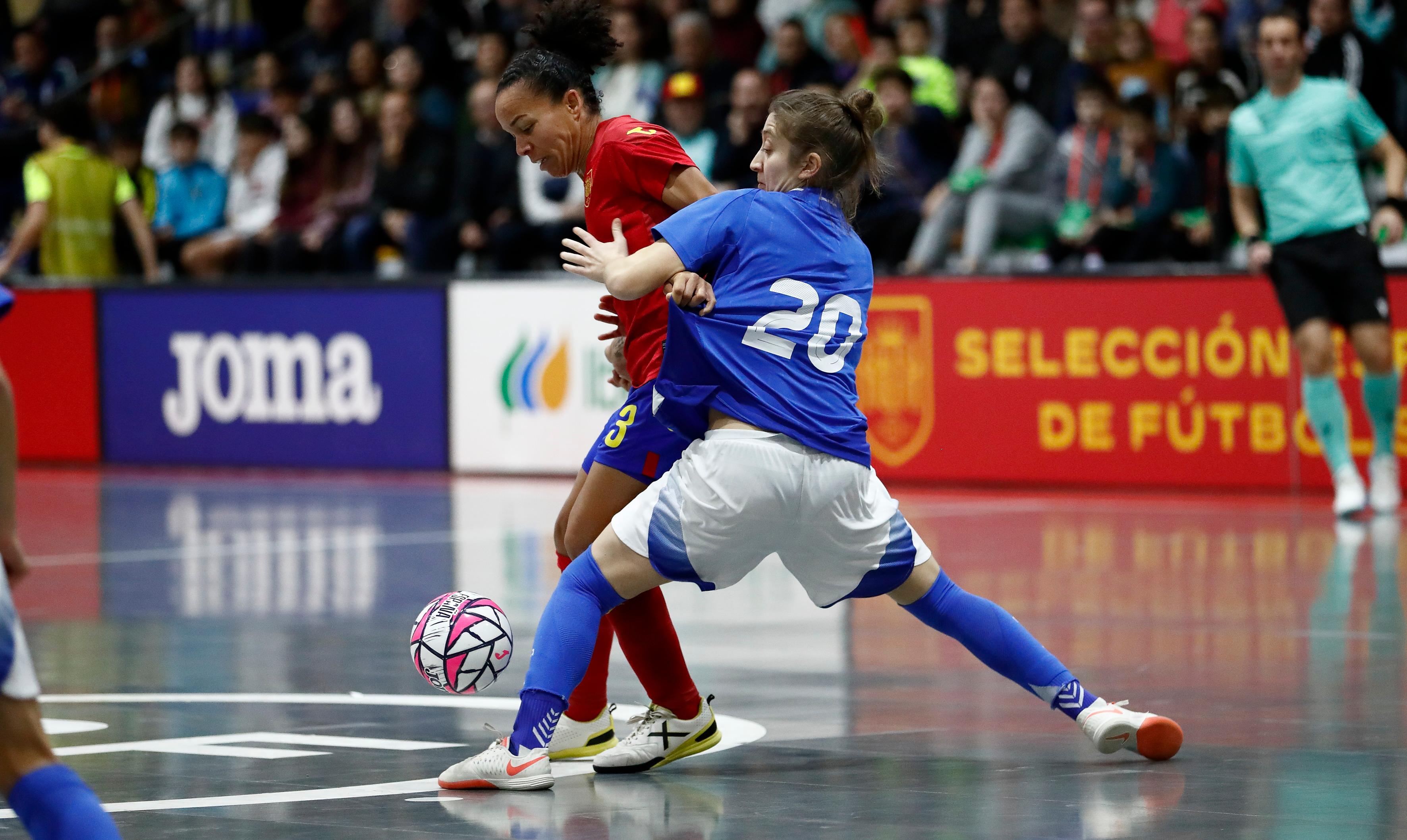 LA PARTITA. Il quintetto di partenza scelto da Francesca Salvatore è sempre lo stesso, con Sestari in porta, Borges, Coppari, Adamatti e Boutimah. La Spagna cambia invece due interpreti, perché fra i pali c’è Caridad per Ari e Celia al posto di Peque: Laura Cordoba, Lujan e Vane Sotelo completano le cinque con cui parte Claudia Pons. La prima emozione della partita la regalano le Azzurre dopo 2’: Adamatti ruba palla in pressione e si presenta quasi al limite dell’area di rigore, ma sul suo mancino angolato Caridad è decisiva nel deviare in calcio d’angolo. È una situazione tattica, quella della pressione, che a inizio partita regala fiducia a Coppari e compagne che, con grande personalità, ‘vanno a prendere alta’ la Spagna rubando più di un pallone in prima linea. Un inizio che viene premiato dalla rete del vantaggio: Ghilardi calcia dai 10 metri, Caridad respinge e da posizione laterale Erika Ferrara trova il varco vincente per l’1-0. Il gol aumenta il livello di consapevolezza delle Azzurre: da rimessa laterale ancora Ferrara scaglia un sinistro di difficile gestione per Caridad e sulla sua respinta è un altro tap-in, questa volta di Dal’Maz, a regalare il meritatissimo raddoppio all’Italia. La Spagna non fa mai male nei primi 20’ a Sestari e ha un’unica grande chance a 17’’ dalla fine con il tiro libero di Antia, calciato però largo.