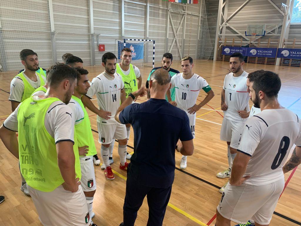 La partita. La Finlandia conferma di essere una squadra molto aggressiva, mettendo gli Azzurri in difficoltà dal punto di vista fisico e raggiungendo quota tre falli dopo appena tre minuti dal calcio d’inizio. Nonostante il predominio del gioco da parte dell’Italia, sono gli Scandinavi però ad avere la più grande occasione per sbloccare il confronto alla metà esatta della prima frazione, ma un triplo miracolo di Miarelli in rapida sequenza evita la marcatura dei ragazzi di Mico Martic; in particolare è prodigioso l’ultimo intervento con un salvataggio proprio sulla linea. Al 13’ l’episodio che sblocca il confronto: Kangas avanza palla al piede nella metà campo azzurra, ma la sua conclusione viene intercettata da Merlim, bravo e preciso a trovare quindi il pallonetto vincente dalla distanza con la porta sguarnita. Quando sul cronometro mancano poco meno di 5 minuti all’intervallo, il doppio cartellino giallo rimediato da Murilo costringe l’Italia all’inferiorità numerica. Nei due minuti in 4 contro 5 la difesa azzurra è coriacea e puntuale, e viene salvata anche dal palo sul siluro di Autio, consentendo così agli Azzurri – guidati anche quest’oggi in panchina da Vanni Pedrini al posto del Ct Bellarte – di tornare negli spogliatoi sull’1-0 di vantaggio.