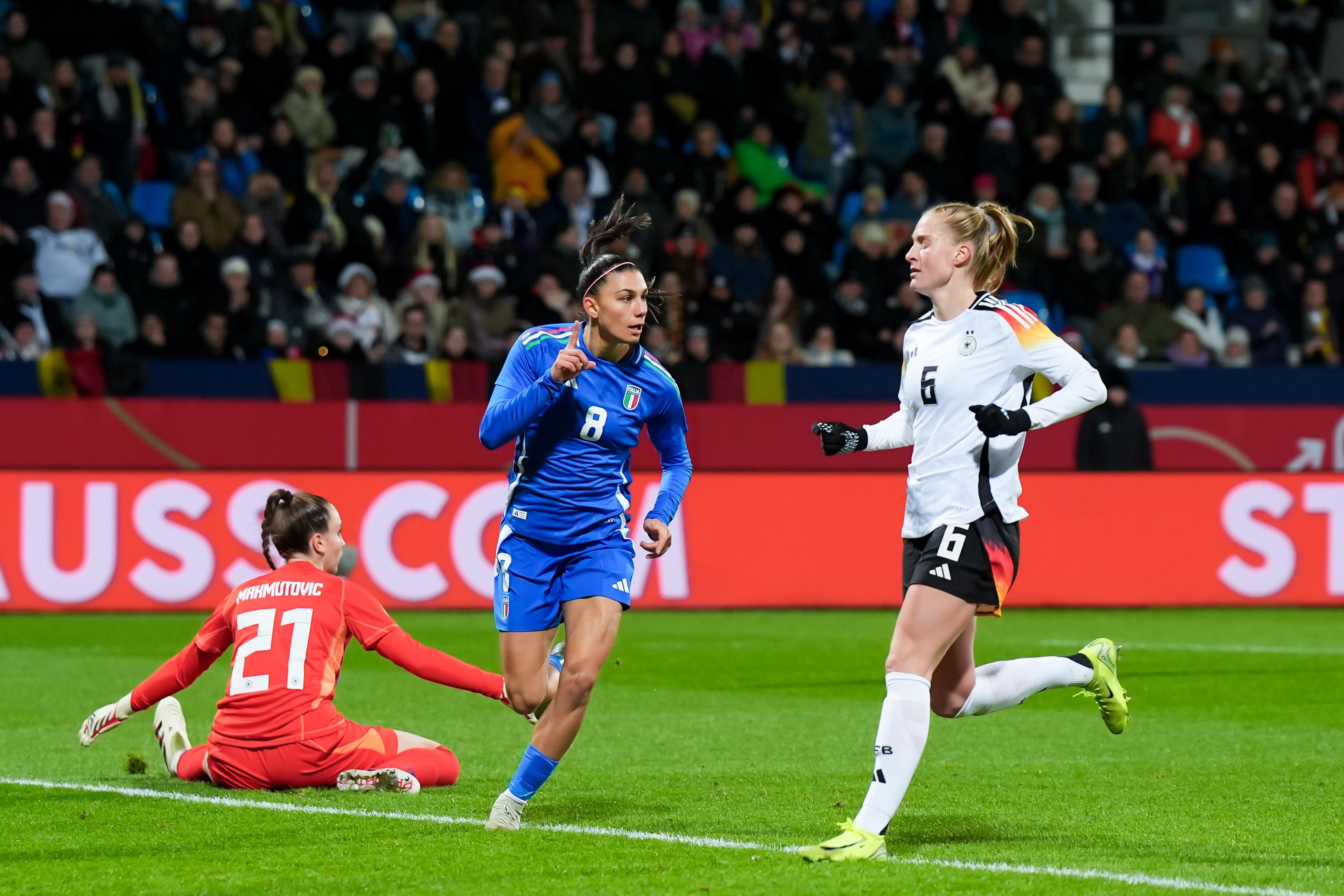 COSENZA, ITALY - APRIL 05: Agnese Bonfantini of Italy celebrates after scoring her team's second goal during the UEFA EURO 2025 Women's Qualifiers between Italy and Netherlands at Stadio San Vito on April 05, 2024 in Cosenza, Italy. (Photo by Maurizio Lagana/Getty Images)