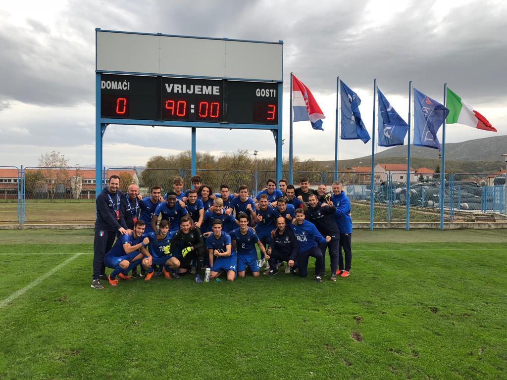 Tre su tre. Al Gradski stadion di Sinj, la Nazionale Under 17 vince 3-0 contro i padroni di casa della Croazia e conclude questa prima fase di qualificazione agli Europei di categoria con un percorso netto. Dopo aver vinto la prima con Andorra (7-0), la seconda contro l’Armenia (3-0), i ragazzi terribili di Carmine Nunziata non mancano l’appuntamento più importante contro la squadra più temibile del gruppo 13, giocando con autorità senza concedere nulla ai croati. Al 34’ di gioco apre le danze il solito Nicolò Cudrig, alla sua quarta realizzazione in questo torneo, seguito da Sebastiano Esposito al 37’ che chiude il primo tempo sul 2-0. Nella ripresa, ci pensa il difensore destro, lo juventino Francesco Lamannna ad arrotondare il risultato e concludere il match col punteggio di 3-0.