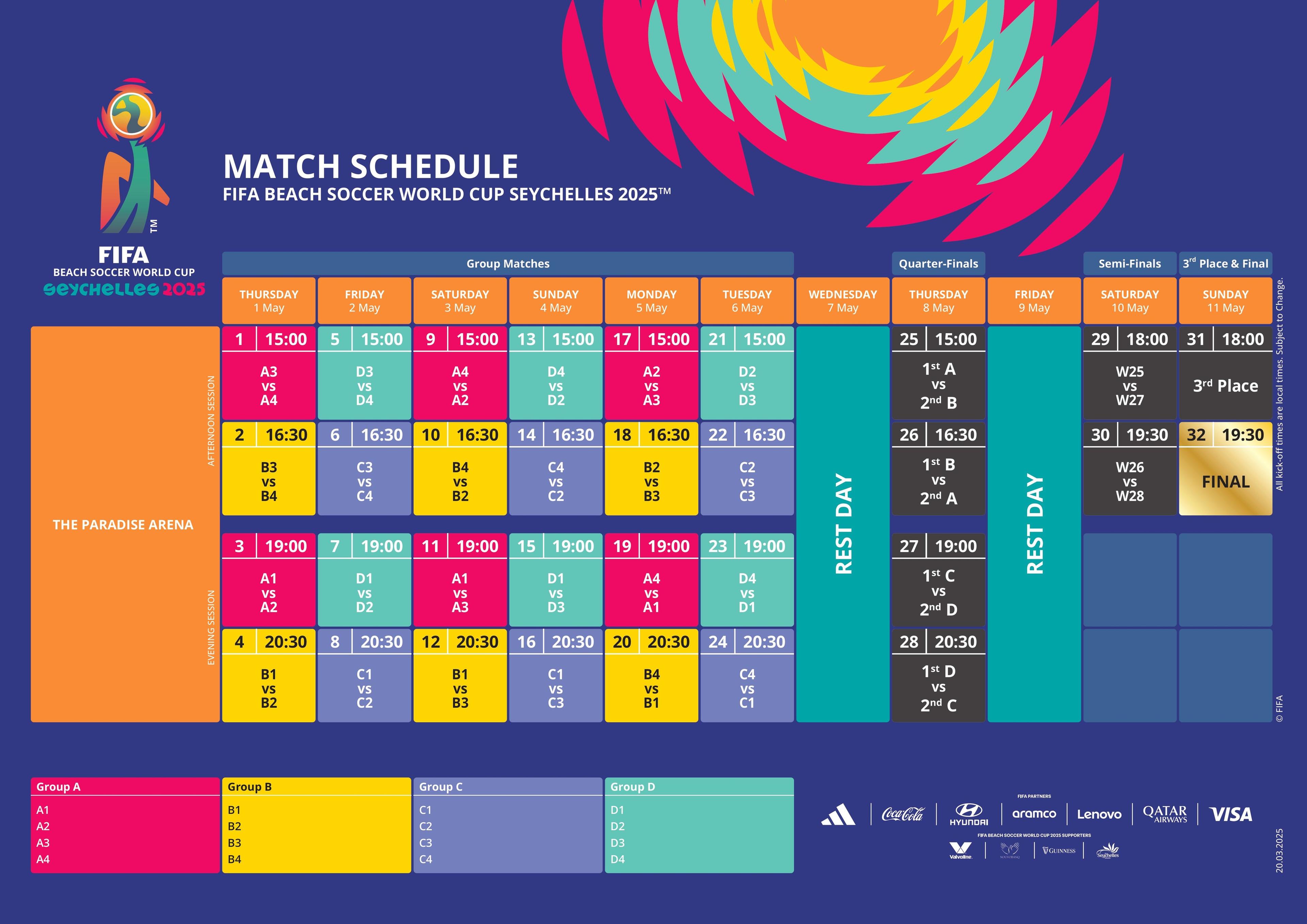Prima di raggiungere la sede del Mondiale, però, il 15 aprile gli Azzurri voleranno a Madeira per disputare a Funchal due amichevoli con il Portogallo domenica 20 e lunedì 21. Il Ct Emiliano Del Duca ha invece chiamato 22 calciatori per l’imminente raduno di Tirrenia, ritrovando fra i convocati parte del nutrito nucleo di viareggini, con Luca Bertacca, Tommaso Fazzini, Gianmarco Genovali e Alessandro Remedi, a cui si aggiunge anche Fabio Pugliese, che tornano così a disposizione del commissario tecnico. Il conto alla rovescia che porta al Mondiale è partito: venerdì 4 aprile si terrà il sorteggio direttamente dalle Seychelles e gli Azzurri scopriranno il proprio girone. Le 16 squadre verranno suddivise in quattro gironi da quattro. Le prime due di ciascun girone accederanno alla fase a eliminazione diretta, nella quale si disputeranno quarti di finale, semifinali, finale per il terzo posto e finalissima.