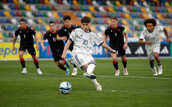 PARTITA. Gli Azzurrini partono subito forte e, al 4', conquistano un calcio di rigore: corner dalla destra calciato, con il mancino, da Pafundi per Chiarodia che, inseritosi sul secondo palo, calcia a rete con il mancino trovando il braccio del georgiano Bukia. Dagli undici metri si presenta Pafundi che, con un preciso sinistro rasoterra, spiazza l'estremo difensore avversario, Kurtanidze, sulla sinistra realizzando il suo 3° gol in 3 partite in questa fase élite. I ragazzi di Bernardo Corradi continuano ad attaccare e, dopo una debole conclusione con il mancino di Basiladze al quarto d'ora, trovano il gol del raddoppio: Palestra, servito nei pressi del vertice destro dell'area di rigore avversaria dal retropassaggio del vicino Misitano, si coordina e, di prima intenzione, lascia partire un mancino a giro che trafigge il numero 1 georgiano sotto il sette alla sinistra.