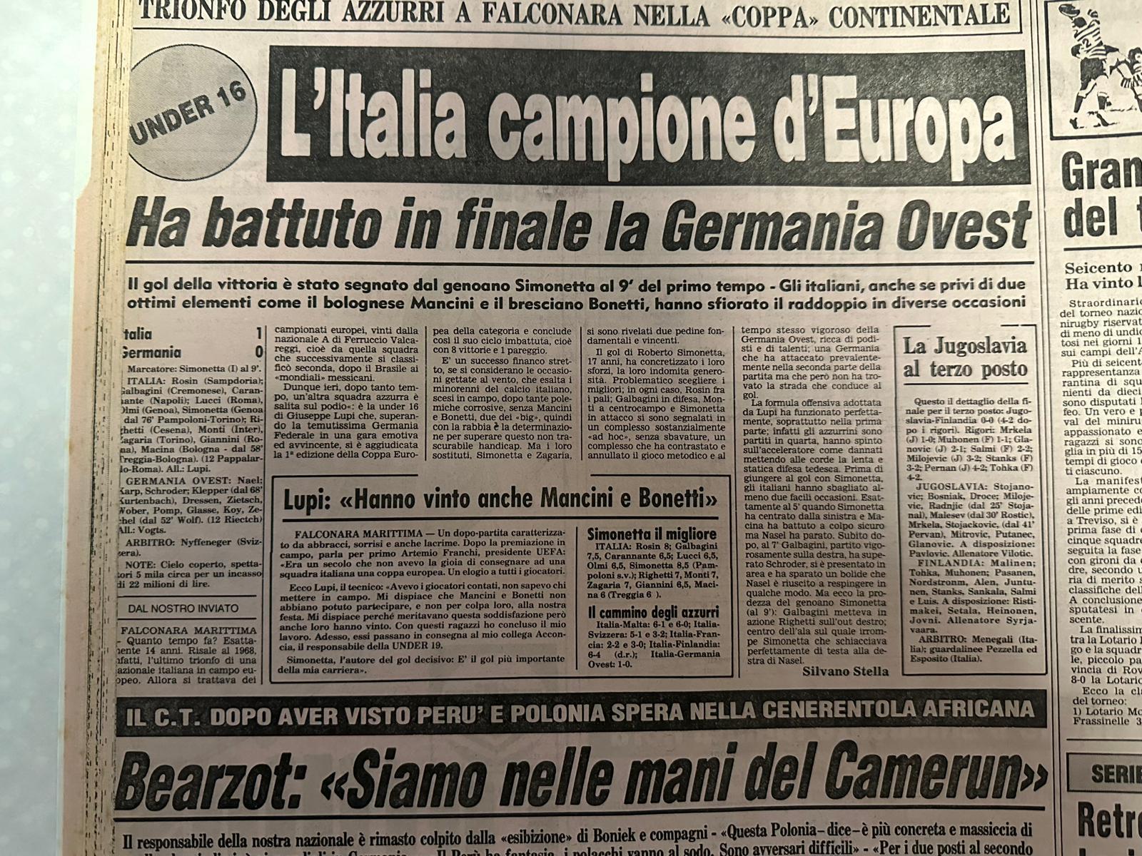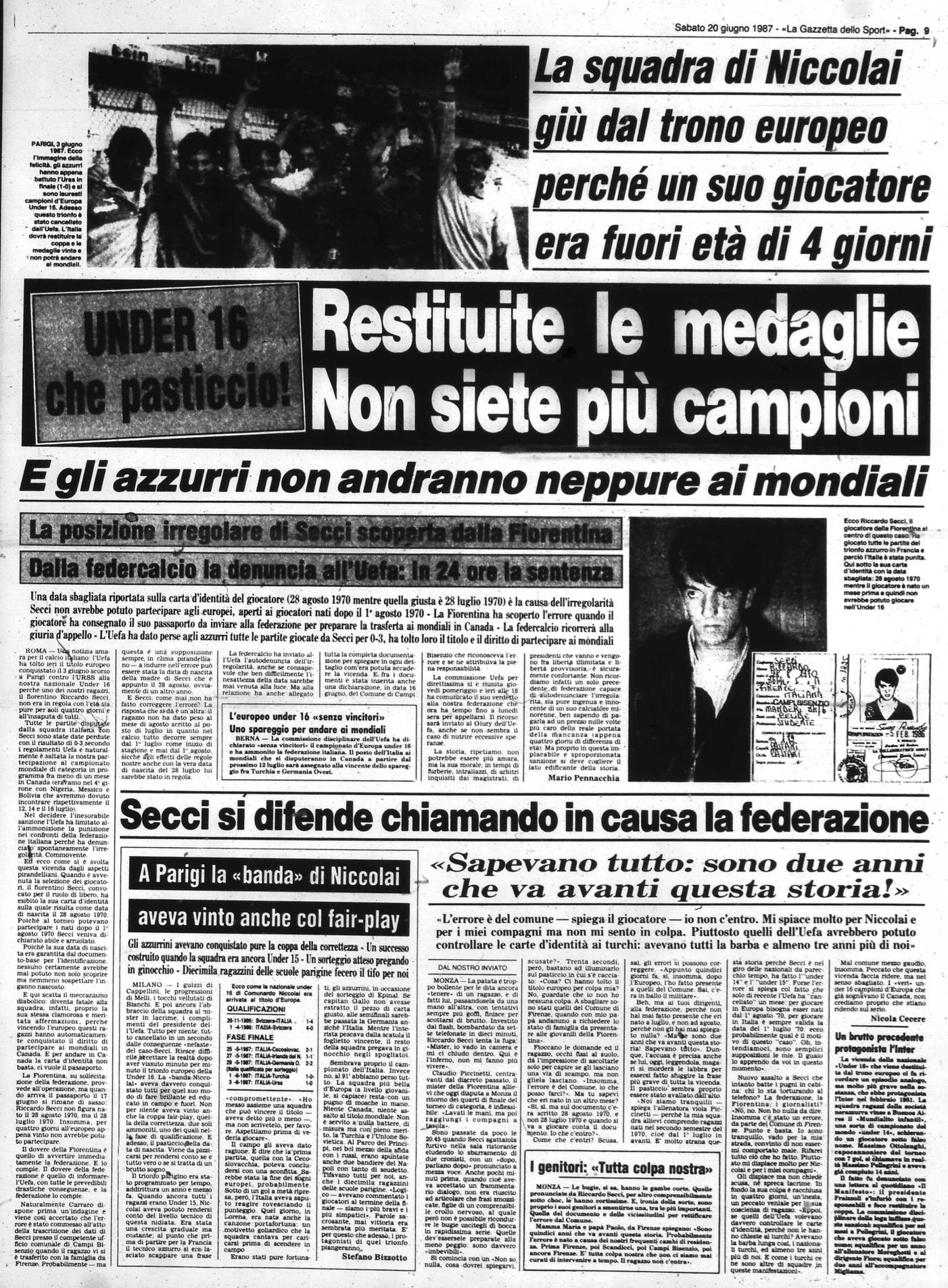 C’è poi la vittoria revocata del 1987: l’Italia Under 16 batte l’URSS nella finale europea al Parco dei Principi di Parigi il 3 giugno. Il trofeo, però, non è riconosciuto agli Azzurri, per la posizione irregolare del calciatore della Fiorentina Roberto Secci. Prima della partenza per il Mondiale di categoria, la FIGC rileva sul passaporto una data di nascita diversa da quella del documento di identità, segnala il caso alla UEFA che revoca il titolo. La FIFA permetterà all’Italia di partecipare al Mondiale Under 17 in Canada. Dove arriva il 4° posto, miglior risultato di sempre nella competizione. Da quella finale del 3 giugno 1987, come una maledizione per l’errore commesso, l’Italia non vincerà più né a livello di Under 16 né di Under 17, il torneo nato dopo la riforma del 2001. Sono passati 37 anni.