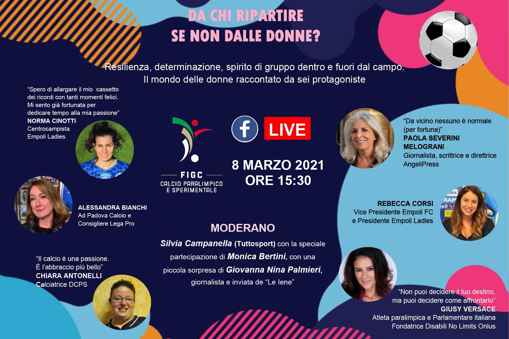 "Da chi ripartire se non dalle donne?", è questo il titolo del webinar organizzato lunedì 8 marzo alle ore 15:30 nel secondo appuntamento live sulla pagina Facebook della Divisione Calcio Paralimpico e Sperimentale tramite la piattaforma Cisco Webex Meetings nell’ambito delle iniziative ideate dalla DCPS per coinvolgere tutti i tesserati in percorsi alternativi alle competizioni calcistiche attualmente sospese.