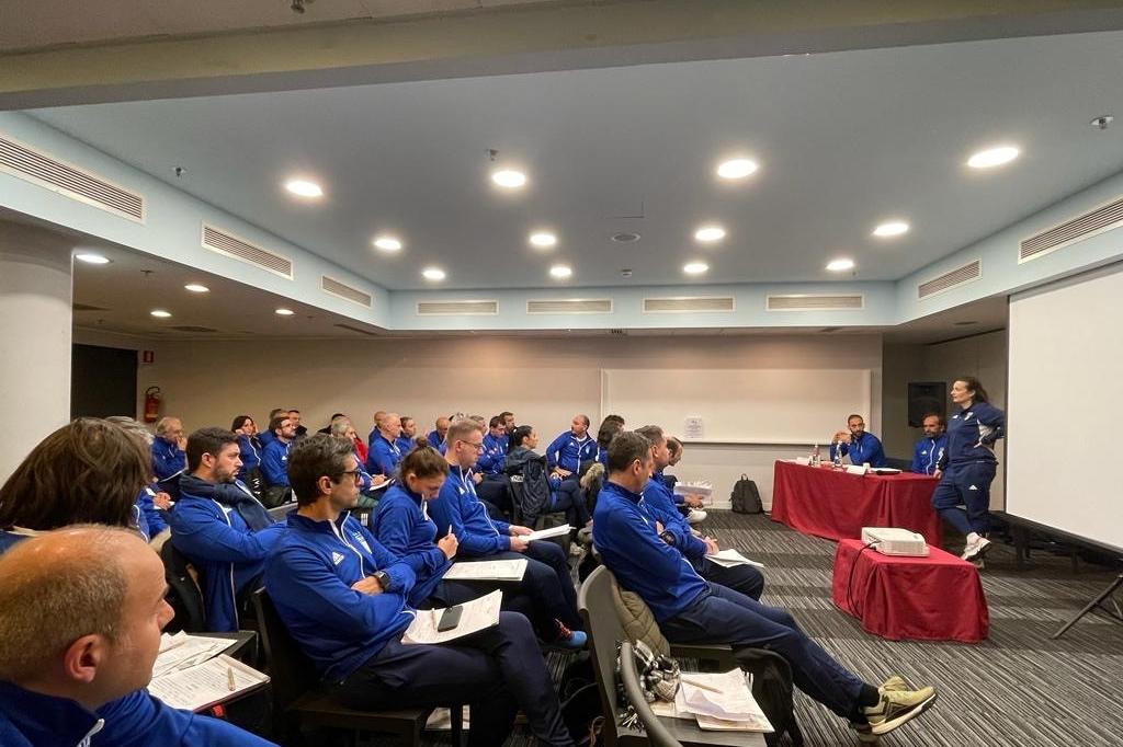 Siamo giunti ormai alle battute finali: terminato il ciclo di lezioni online, restano da completare quelle in presenza, le cui prime sessioni si sono svolte sabato 16 e domenica 17 dicembre a Roma, con una parte 'sul campo', al Circolo Tor Tre Teste (nell'impianto normalmente utilizzato per le partite della Competizione Nazionale DCPS), e una più teorica, che si è tenuta in una sala all'interno di un albergo sempre della capitale (vedi foto grande in alto).