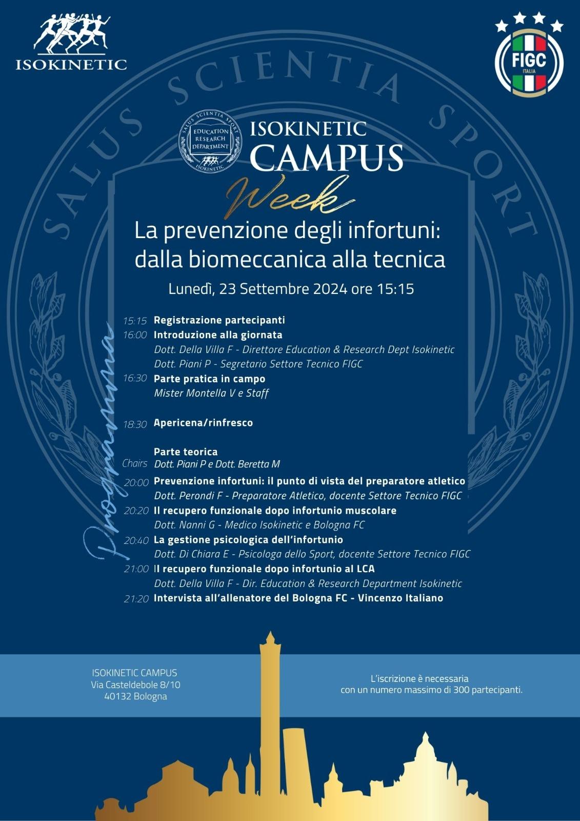 All’interno della settimana di festeggiamenti per l’inaugurazione dell’Isokinetic Campus, il Settore Tecnico della FIGC e AIAC – in collaborazione con Isokinetic - hanno infatti organizzato questo seminario – che sarà valido come corso di aggiornamento per tutti gli allenatori e i preparatori atletici - che vedrà la partecipazione tra gli oratori del Ct della nazionale turca, Vincenzo Montella, e dell’allenatore del Bologna, Vincenzo Italiano. Montella terrà una lezione dal titolo ‘Parte pratica in campo’, mentre Italiano chiuderà il programma in serata rispondendo a un’intervista.