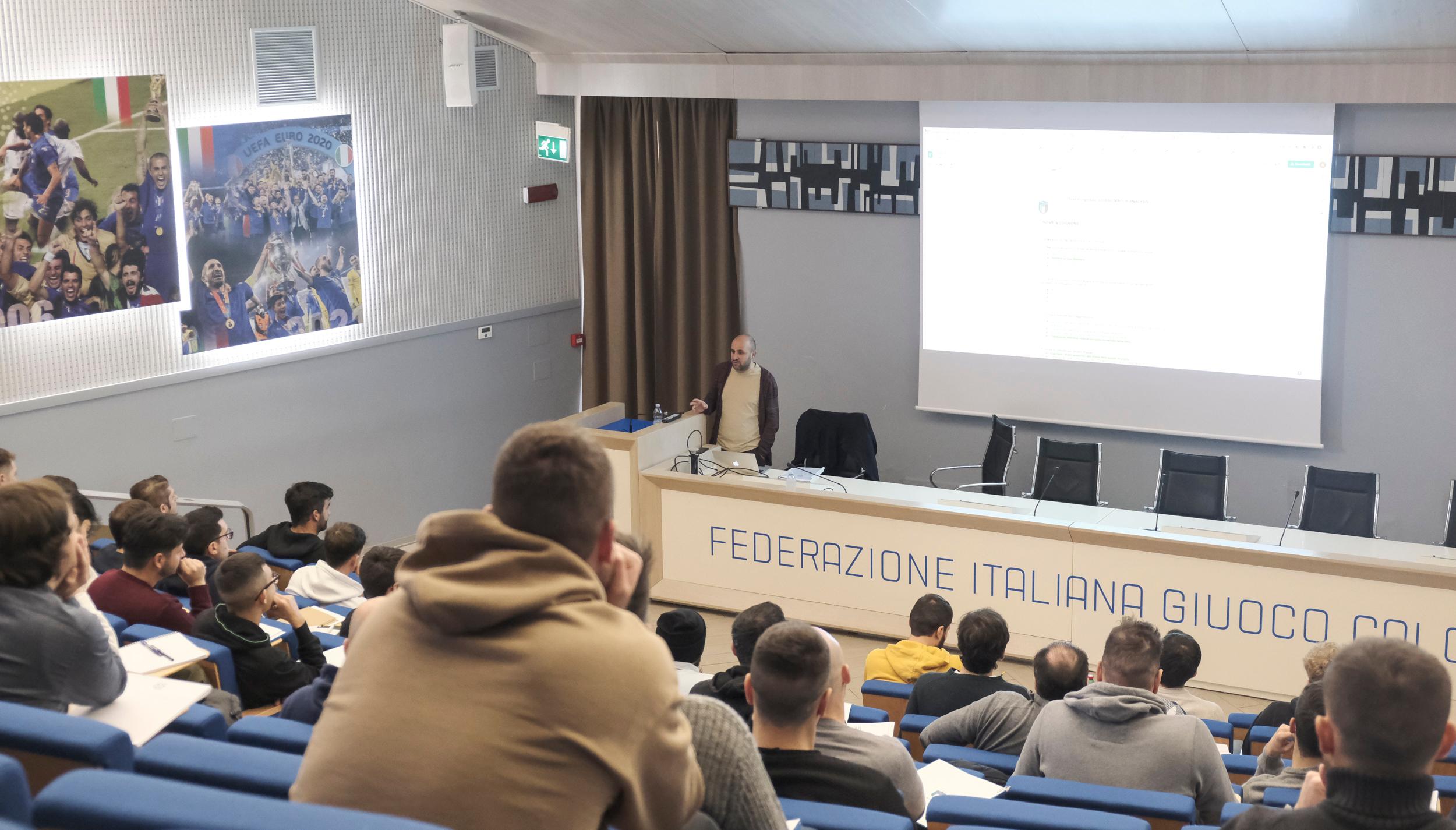 A introdurre gli allievi in questa loro prima giornata di lezione al Centro Tecnico Federale, il coordinatore del corso – e già match analyst della Nazionale campione d’Europa a Euro2020 – Antonio Gagliardi.