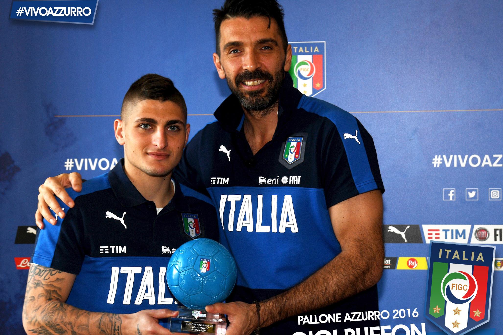 Gianluigi Buffon è il primo azzurro tra i vincitori del Pallone Azzurro 2016 ad avere ritirato il premio! A consegnarglielo a Coverciano è stato il vincitore dell'anno precedente Marco Verratti.