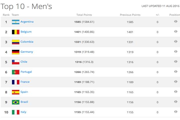 Nessun cambio nella top ten del Ranking Fifa di agosto. Dopo gli stravolgimenti dovuti agli Europei e alla Coppa America, nessuna variazione nelle prime venti posizioni. L’Italia si conferma al decimo posto. Al comando resta l'Argentina con 1585 punti, seguita da Belgio (1401), Colombia (1331), Germania (1319) e Cile (1316). I campioni d'Europa del Portogallo sono sesti (1266), seguiti dai vice-campioni della Francia (1189) che il mese scorso hanno scalato la classifica guadagnando ben dieci posizioni. Ottava la Spagna (1165), nono il Brasile (1156) mentre a chiudere la top ten è ancora l'Italia (1155).Per il resto il primo cambiamento da registrare riguarda la 21esima posizione con ilCosta Rica (883) che guadagna 6 posizioni e si piazza alle spalle di Turchia e Ungheria appaiate al 19esimo posto. Passi avanti anche per Giappone (49°, +8), Corea (99, +18) e Mauritania (104,+15), mentre Cuba precipita al 151esimo posto perdendo trenta posizioni.RANKING FIFA1. Argentina 1585 punti (--)2. Belgio 1401 (--)3. Colombia 1331 (--)4. Germania 1319 (--)5. Cile 1316 (--)6. Portogallo 1266 (--)7. Francia 1189 (--)8. Spagna 1165 (--)9. Brasile 1156 (--)10. ITALIA 1155 (--)