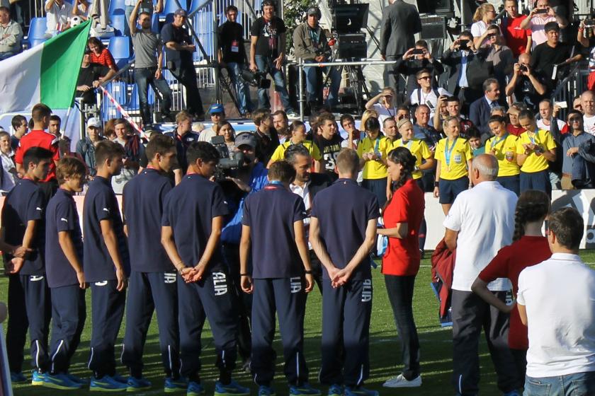 La suggestiva cornice della Piazza Rossa a Mosca ha offerto lo spettacolo che la celebrazione dei mille giorni dai prossimi Campionati Mondiali meritava. Una giornata estiva ha accompagnato il simbolico torneo tra selezioni Under 16 predisposto dal Comitato Organizzatore Locale della Fifa, che ha allestito un campo in erba sintetica sulla Piazza Rossa. Davanti a spalti gremiti, la Spagna si è aggiudicata la finale contro i padroni di casa vincendo 4-2. I ragazzi della selezione Italiana hanno perso i due incontri con la Russia prima (5-2) e le Germania poi (8-4).Gianluca Zambrotta, in questa occasione ambasciatore del calcio italiano, ha espresso tutta la sua ammirazione per la qualità dell’evento: "Un'idea assolutamente brillante quella di montare un campo di calcio in un luogo così inusuale. La suggestione è stata tanta e i primi a esserne colpiti sono stati proprio i ragazzi della nostra rappresentativa. Oggi è stata l’ulteriore dimostrazione – conclude il campione del mondo – di come la macchina organizzativa dei prossimi Mondiali sia efficiente e creativa. Una bella giornata di sport". Una giornata che ha visto giocare ex star del calcio internazionale, come Matthaus e Hierro, insieme ai bambini e Zambrotta nei panni inediti dell’arbitro, all’interno di un fun village approntato nei pressi del Mausoleo di Lenin. Inizia il count down della Fifa World Championship – Russia 2018, ed un orologio sulla Piazza Rossa sarà lì a ricordarlo.Nella foto in alto, Gianluca Zambrotta premia i ragazzi dell'Italia.
