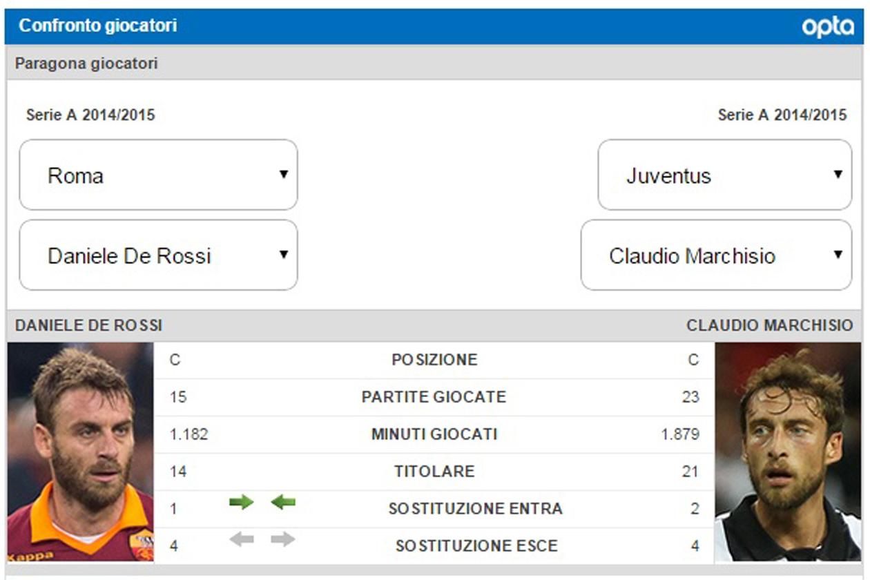 Stasera all'Olimpico il big-match Roma-Juventus propone un confronto in chiave azzurra nel cuore del centrocampo: Daniele De Rossi vs Claudio Marchisio. Anticipiamo il confronto analizzando le loro prestazioni in campionato attraverso le statistiche Opta.Finora, Marchisio è stato impiegato più di De Rossi in questo campionato: 23 presenze (21 da titolare) contro le 15 del giallorosso (14 da titolare).Entrambi hanno percentuali elevate in termini di gestione della palla: 90% di passaggi riusciti per De Rossi, 85,5% per Marchisio. Percentuali che rimangono alte anche quando manovrano nella metà campo avversaria, sempre con una leggera prevalenza del giallorosso: 82,7% contro 81%.A livello di contrasti, De Rossi risulta più efficace nei duelli aerei: 55,9% di contrasti vinti contro il 42,3% di Marchisio. Lo juventino, però, prevale nei contrasti generali: è uscito vittorioso nel 78,3% dei casi a fronte del 73,3% del giallorosso. In perfetta parità il numero complessivo dei cartellini: 5 per parte (4 gialli e un rosso per De Rossi, 5 gialli per Marchisio).A livello di efficacia in zona gol, infine, prevale Marchisio che ha realizzato 2 reti (De Rossi 1) e confezionato 4 assist (nessun assist per De Rossi).Confronta tutti i calciatori e le squadre della Serie A con il nostro widget centre