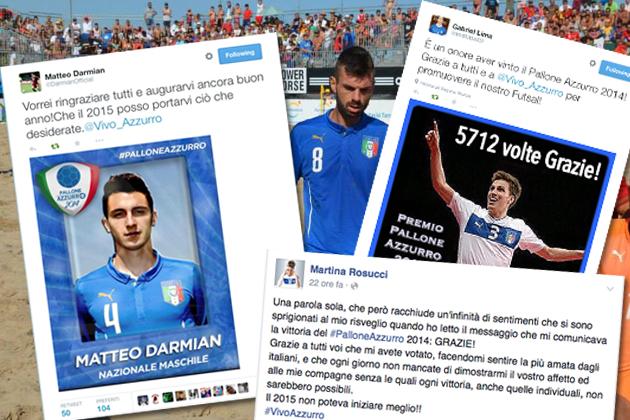 Ieri Vivoazzurro.it ha comunicato i nomi dei quattro calciatori delle nazionali Maschile, Femminile, Fustal e Beach Soccer che hanno vinto il "Pallone Azzurro 2014". A loro volta, Matteo Darmian, Martina Rossicci, Gabriel Lima e Francesco Corosiniti non hanno tardato a ringraziare i Tifosi Azzurri che li hanno votati.