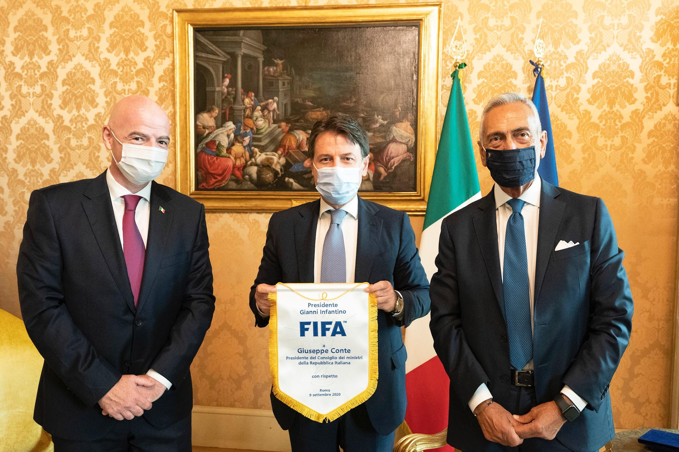 Before meeting the Italian and international press at the FIGC’s headquarters in Rome, FIFA’s number one and Gabriele Gravina met with Italy Prime Minister Giuseppe Conte at the Palazzo Chigi. Among the topics addressed was the resumption of football activities, which also involved discussing the reopening of stadiums: "Football without fans isn’t the same," said Infantino. "However, health is more important. We need to work and see what happens, with people starting to come into close contact again. Our objective is to have fans back in stadiums once more, but we want to work on a return to normality in a calm and professional manner without setting any deadlines." After thanking Infantino for "the love that he’s shown our country and the sensitivity he’s displayed", FIGC President Gravina emphasised how the Prime Minister had closely listened to the concerns of the football world: "When it comes to stadiums, there needs to be a gradual reopening, but this will have to wait until school activities have got going again. The latter will begin first, and then we’ll gradually assess the possibility of reopening stadiums."