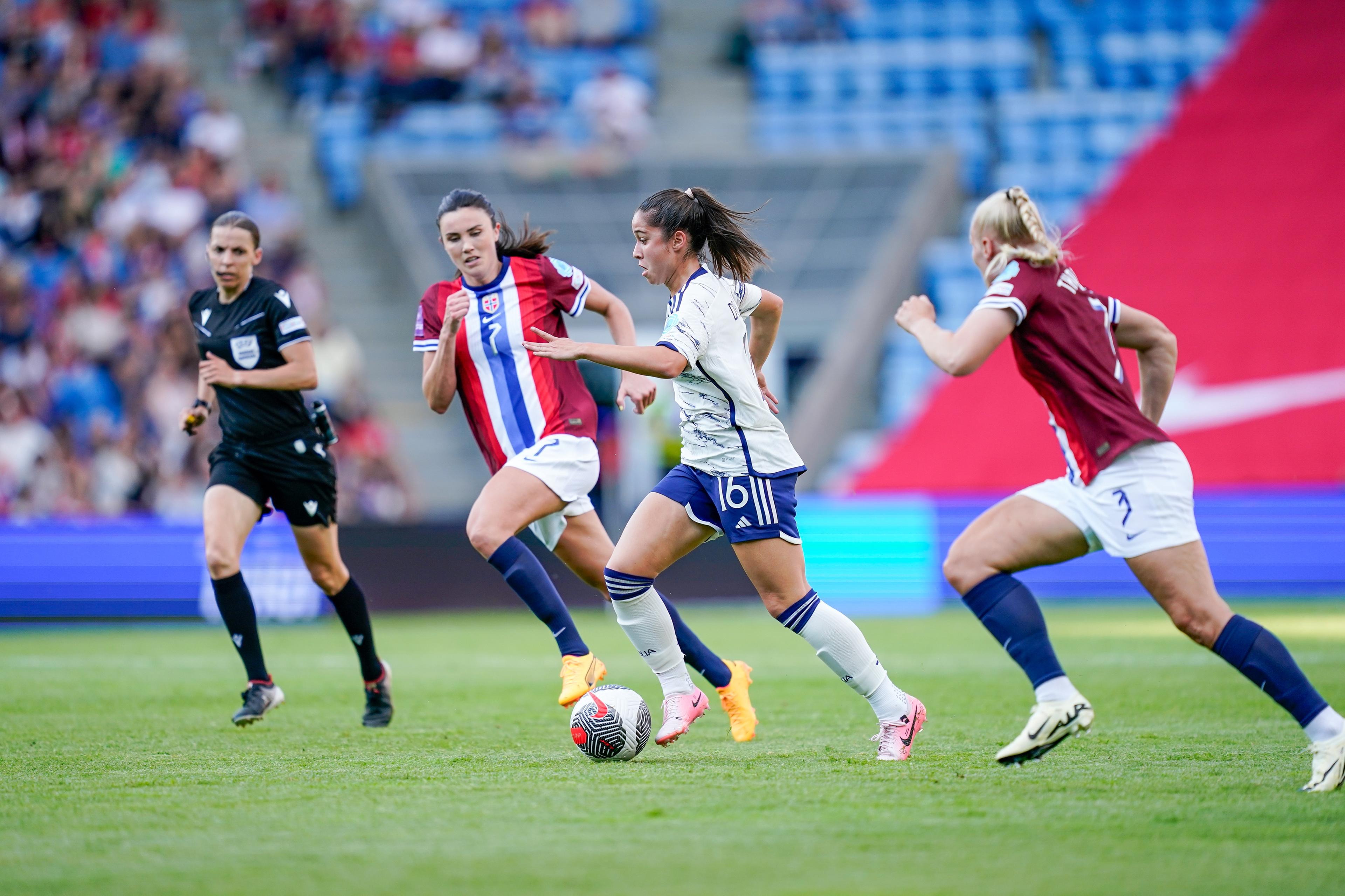 The second half kicked off with Caruso's miracle block, as she slid in to deflect Terland's low shot to deny a certain goal. The game unfolds with continuous end-to-end action, and in the 55', Cantore, perfectly put in by Bonansea, narrowly missed the post with a curling shot from outside the box. Five minutes later, both coaches begin the flurry of substitutions, with Naalsund and Hegerberg coming on for the hosts, while Bonfantini and Dragoni replace the exhausted Bonansea and Greggi. The 17-year-old from Barcelona, in her tenth appearance for the national team, was inspired. On 71', she left a couple of opponents behind and unleashed a rocket that narrowly missed the crossbar.