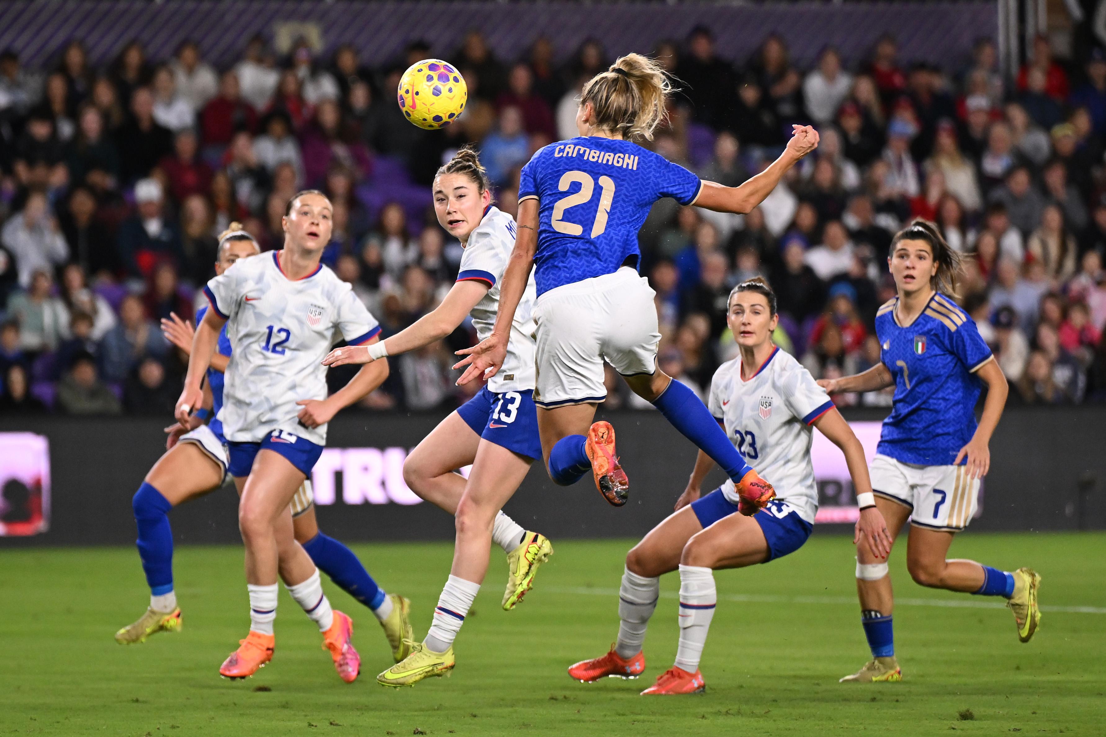 For his first non-European test as head coach – the 16th meeting between Italy and the American powerhouse (with only one Italian win, in 2001) – Soncin stayed with his fluid 4-3-3. Giuliani started in goal behind centre-backs Lenzini and Linari, with Bergamaschi and Boattin out wide. Giugliano and Caruso returned in midfield alongside Greggi, while up front were Beccari, Cambiaghi and Cantore, already a fan favourite in the United States. Hayes, the former Chelsea manager now two years into her USA tenure, lined up her side in their familiar 4-2-3-1, with in-form forwards Moultrie and Macario (standout performers in last month’s wins over Portugal and New Zealand) leading the attack.