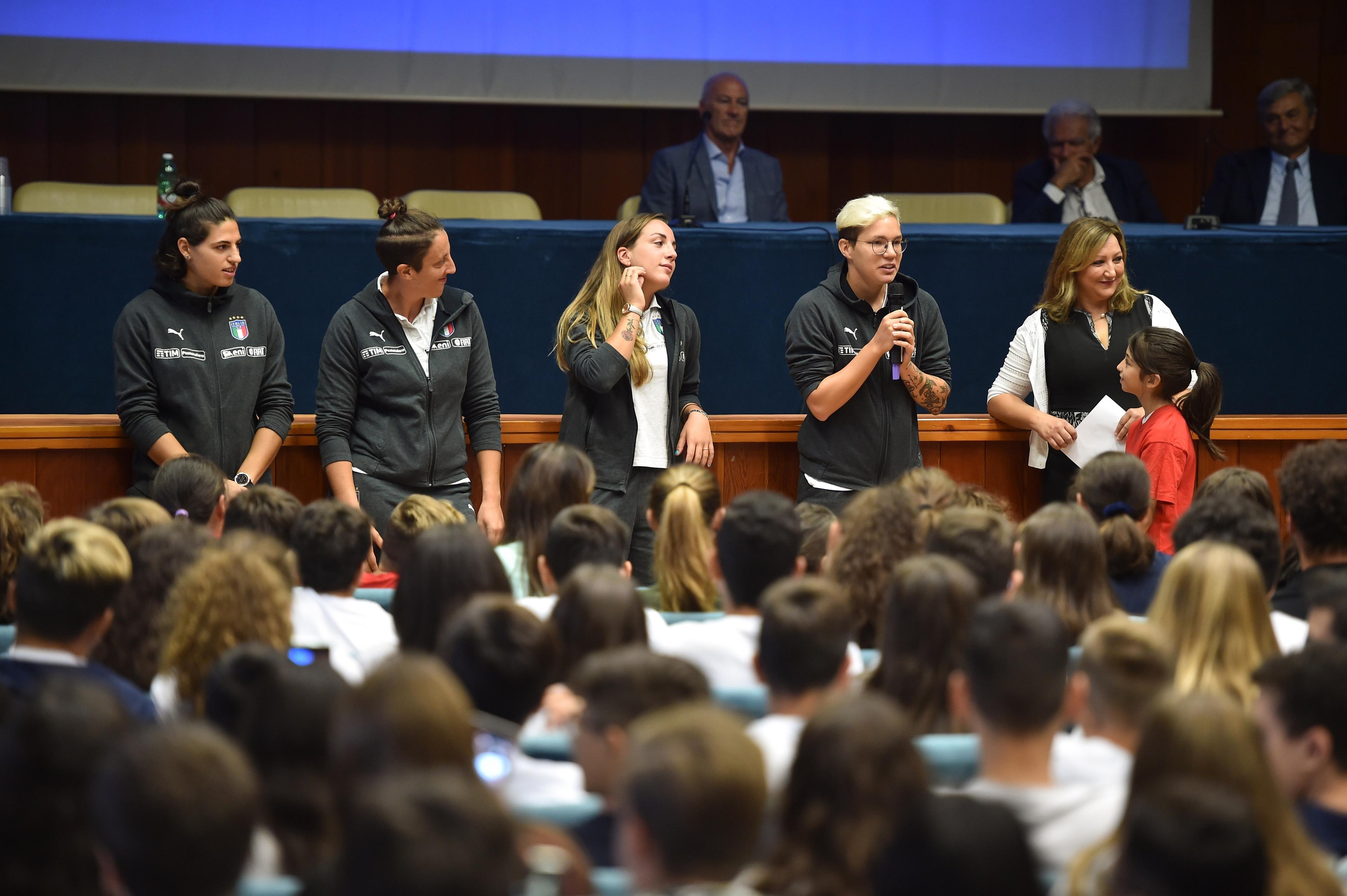This morning, 500 students from Palermo schools met a delegation from the team at the Cittadella Universitaria. At the event, assistant delegation head Barbara Facchetti spoke along with the players Elena Linari, Rachele Baldi and Gloria Marinelli who spoke about their experiences and answered questions. They discussed sport in the local area where there has been increased participation in girls’ football projects. Also, there was Rosalia Pipitone, the Roma goalkeeper from Palermo who retired from international football after the World Cup.