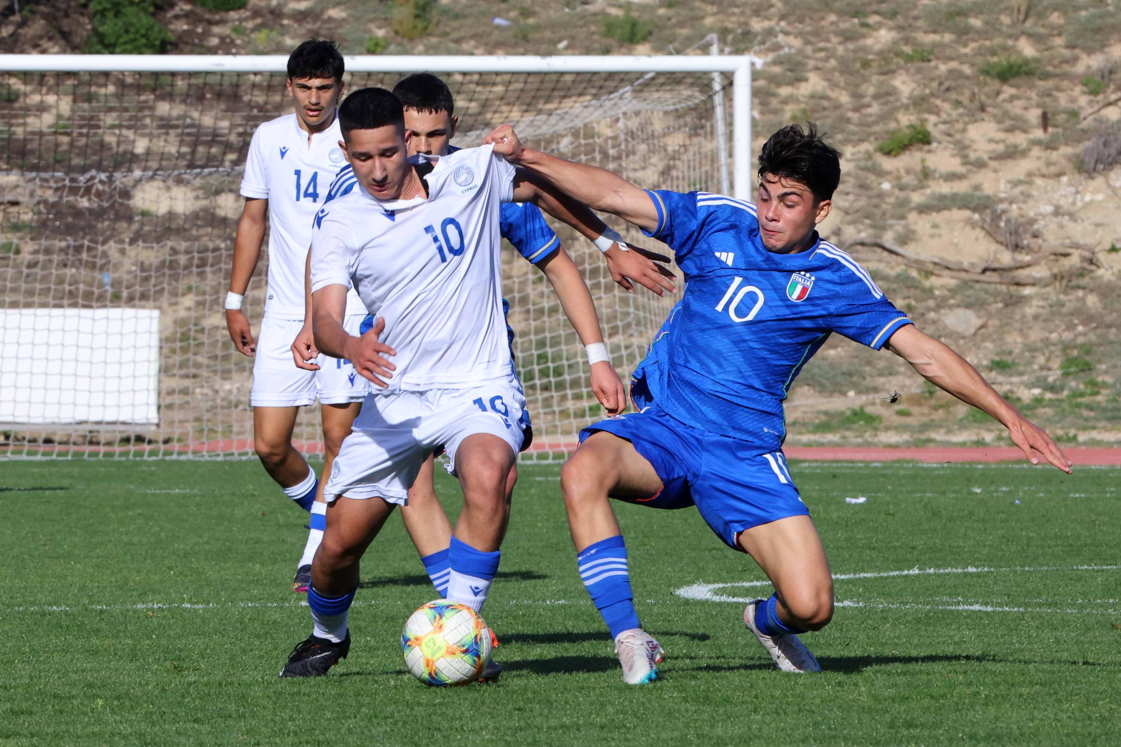 The match. In the first quarter of an hour the two teams studied each other and it was not until the 18th minute that the first action of note occurred: a through ball from Romano set up Romagnoli, who slotted the ball into the net, but the referee whistled for offside and ruled it out. Cyprus responded a minute later with a fine move in the box between Sofokleus and Kostantinou, who headed Tzouliou's shot just wide. In the 28th minute Italy took the lead: a free-kick taken by Crapisto on the left flank found Sadotti in the box, who broke through and sent the ball into Papakostantinou's net. There was another chance for Scotti, whose header, off a corner kick taken by Crapisto, grazed the woodwork.
