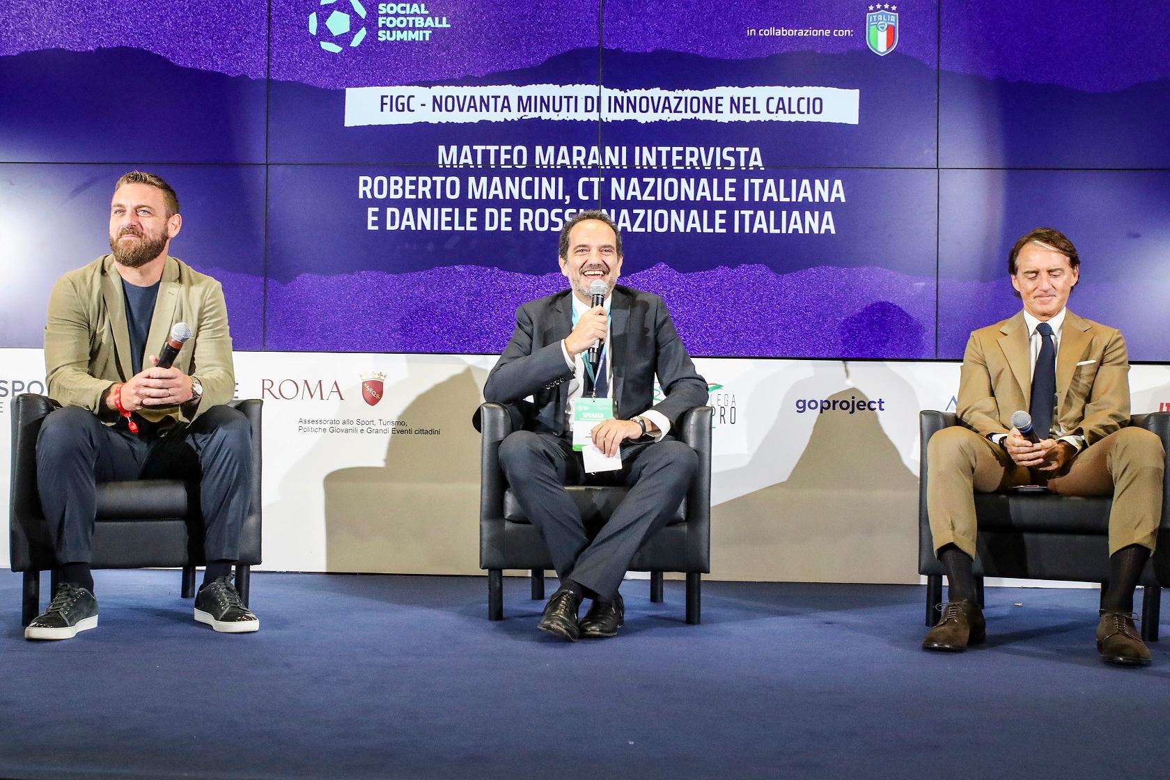 Only a few hours after sealing a place in the Nations League Final Four, Italy Head Coach Roberto Mancini and his assistant Daniele De Rossi were guests at the Social Football Summit, an event, currently taking place at Stadio Olimpico in Rome, dedicated to innovation and digital transformation in the Football Industry. Several are the themes being discussed in the panel chaired by journalist Matteo Marani, from the modernisation of football and articulating sporting news to the advent of new technologies, of social media and big data.