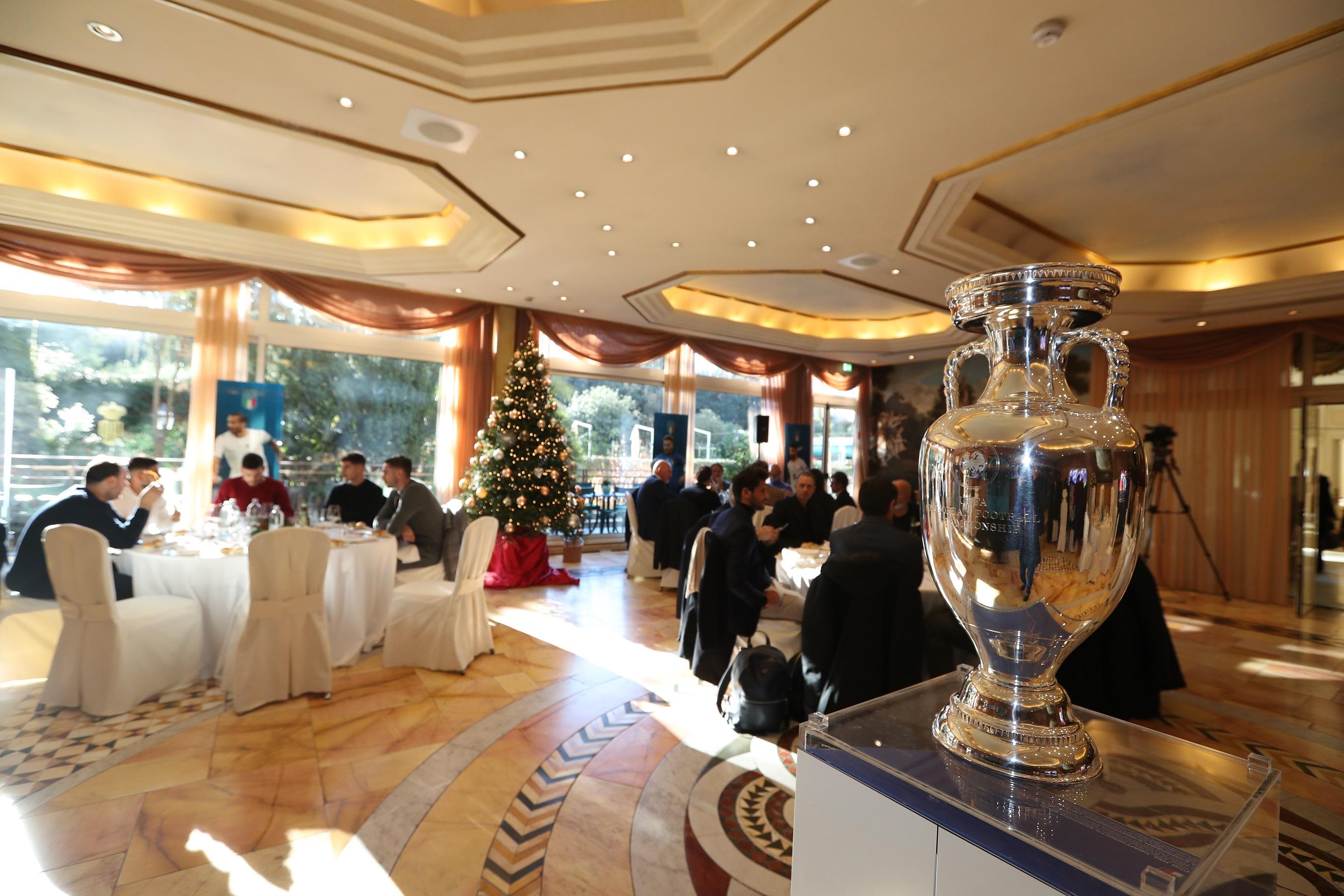 In the hotel in Rome that hosted the the 'Notti Magiche' of EURO 2020, the Azzurri met for lunch today together with FIGC president Gabriele Gravina and coach Roberto Mancini. Obviously, they could not miss a guest who has become an integral part of the group since 11 July, the Cup that they raised to the sky at Wembley and on display at Parco dei Principi next to the backdrop of the London triumph.