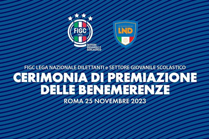 La Federazione Italiana Giuoco Calcio, la Lega Nazionale Dilettanti e il Settore Giovanile e Scolastico della FIGC si ritroveranno tutte insieme sabato 25 novembre a Roma per la cerimonia di consegna delle Benemerenze alle società calcistiche e ai dirigenti che negli anni hanno lavorato con passione, dedizione e spirito di servizio. Dalle 11.00, presso l’Holiday Inn Rome Eur Parco Dei Medici (Via Castello della Magliana, 65), i presidenti della FIGC, della LND e dell'SGS, Gabriele Gravina, Giancarlo Abete e Vito Tisci, consegneranno i prestigiosi riconoscimenti che dal 1970 rendono omaggio allo straordinario impegno dei dirigenti e dei sodalizi del calcio di base.