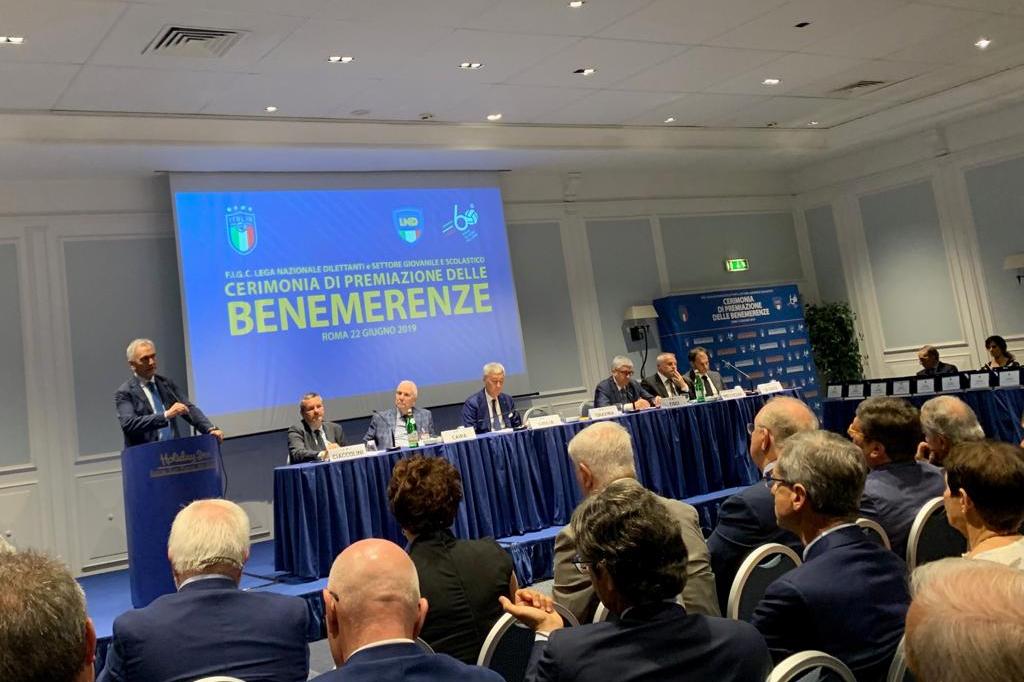 Si è svolta questa mattina a Roma la cerimonia di assegnazione delle benemerenze sportive della Lega Nazionale Dilettanti e del Settore Giovanile e Scolastico, l’evento nazionale che ogni anno premia l’attività pluriennale di società e dirigenti dell’universo dilettantistico e giovanile. Questi i numeri delle onorificenze conferite su proposta dei Comitati Regionali e della Commissione benemerenze: 51 società - delle quali diciassette al traguardo del centenario, quattro arrivate ai 75 anni di attività e trenta al mezzo secolo di storia - più 37 dirigenti federali e 112 dirigenti di società con una carriera di 40 o 20 anni. A consegnare il prestigioso riconoscimento ai protagonisti di giornata il presidente federale Gabriele Gravina, il numero uno della LND e vice presidente vicario della FIGC Cosimo Sibilia e il presidente del Settore Giovanile e Scolastico Vito Tisci.