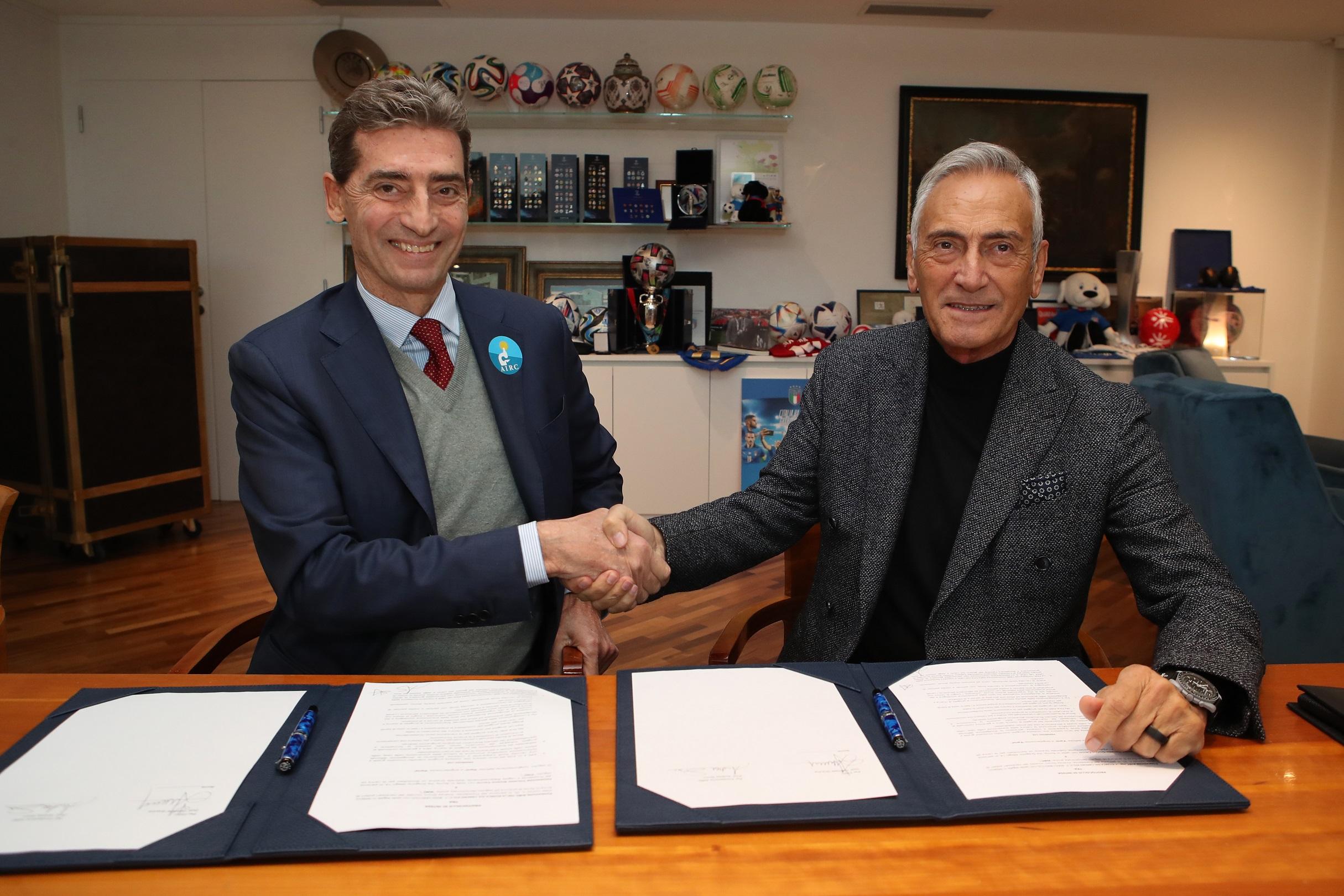 Si rinnova l’impegno della FIGC a supporto della ricerca contro il cancro. Il presidente federale Gabriele Gravina e il presidente della Fondazione AIRC Andrea Sironi hanno firmato questa mattina un protocollo d’intesa con cui la Federazione continuerà a garantire il suo sostegno a ‘Un Gol per la Ricerca’, la storica campagna della Fondazione AIRC che nei ‘Giorni della Ricerca’ vede coinvolto tutto il mondo del calcio. Dal 2015 al 2022 sono stati raccolti 1 milione e 200 mila euro, che corrispondono a 48 borse di studio annuali per i giovani ricercatori in Italia.