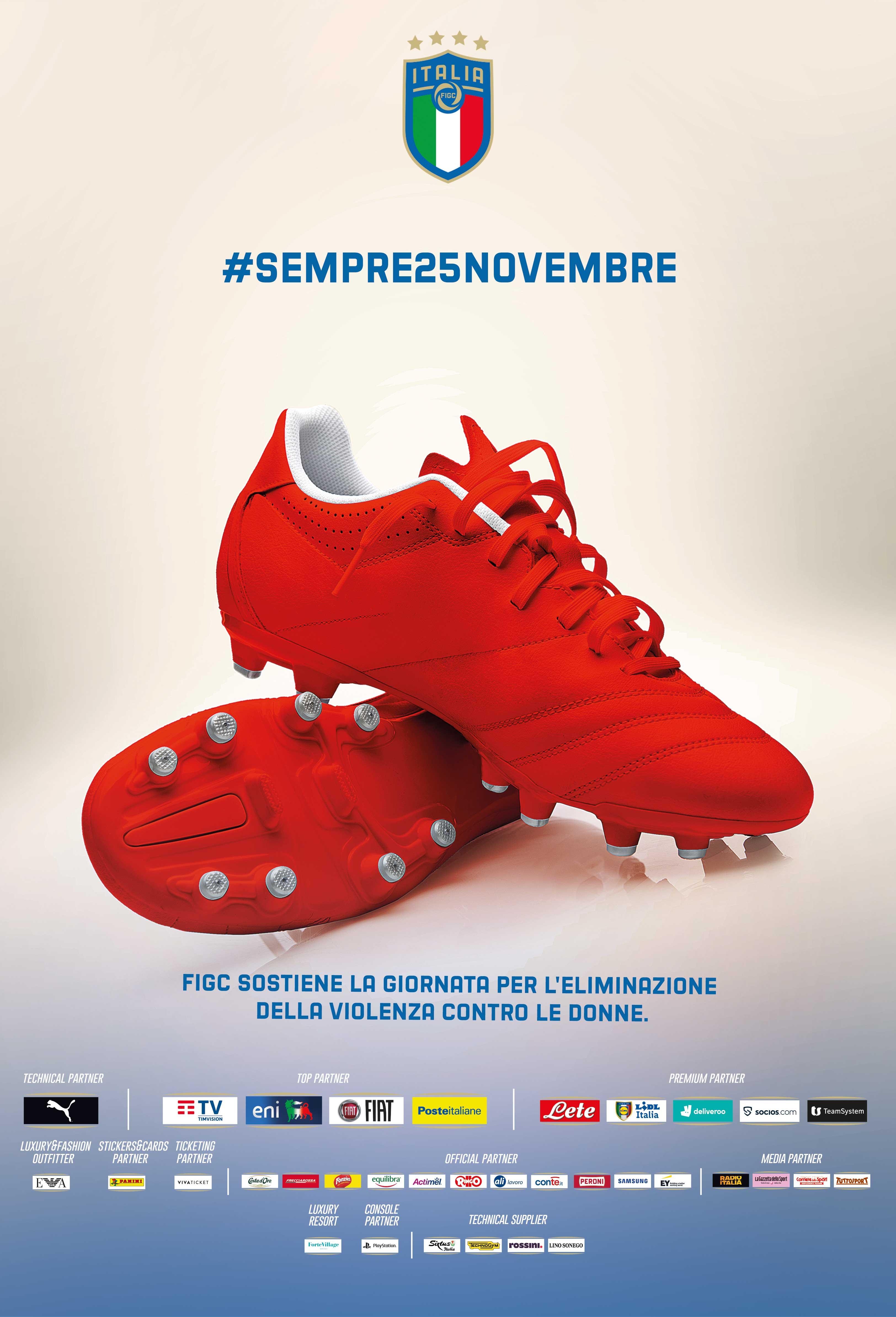 Infine, la FIGC ha scelto di promuovere l’impegno di tutto il calcio italiano per l’eliminazione della violenza contro le donne attraverso una grafica, pubblicata dai quotidiani sportivi questa mattina, dedicata ad un simbolo facilmente riconoscibile: un paio di scarpini rossi. Un omaggio calcistico alle scarpe rosse che dal 2009 sono il simbolo della lotta contro la violenza sulle donne. La creatività della FIGC è accompagnata dall’hashtag #SEMPRE25NOVEMBRE che ha l’obiettivo di sensibilizzare e condannare ogni tipo di violenza contro le donne, ogni giorno. Anche questa campagna, parallelamente a quella per la promozione del numero 1522, sarà promossa per tutta la giornata di oggi sui profili social della FIGC.