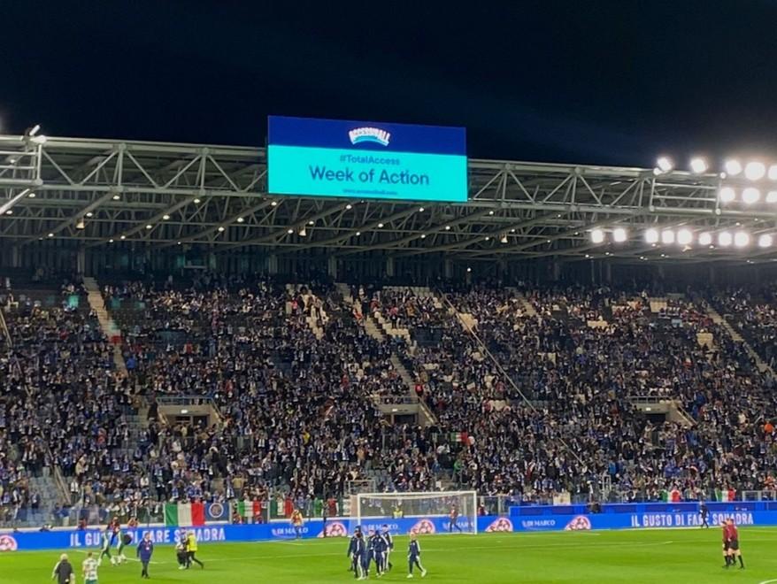 In occasione della Settimana d’Azione per l’Accessibilità, sui maxischermi dello Stadio di Bergamo è stato trasmesso il visual di sensibilizzazione di AccessibALL accompagnato dalla voce dello speaker che ha illustrato al pubblico presente il significato dell’iniziativa, diffondendo l’hashtag #TotalAccess e contribuendo a sensibilizzare sui temi dell’inclusione.