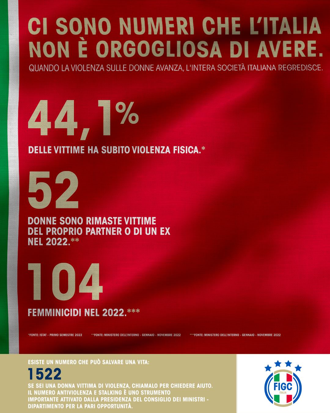 La FIGC, in occasione della giornata internazionale per l’eliminazione della violenza contro le donne, ha sviluppato un progetto che parte da dati rilevanti: i numeri degli episodi di abuso, di maltrattamento fisico e psicologico e di atti persecutori, tutti in continuo aumento. Secondo quanto diffuso dall’Istat, nell’ultimo anno il 44,1% delle donne ha subito violenza fisica o sessuale, mentre sono 52 le vittime del proprio partner o di un ex (fonte: Report della Polizia di Stato 2021). Nel solo 2022, infine, sono stati ben 104 i femminicidi (fonte: Report Polizia Criminale). Numeri, questi, che l’Italia non è orgogliosa di avere.