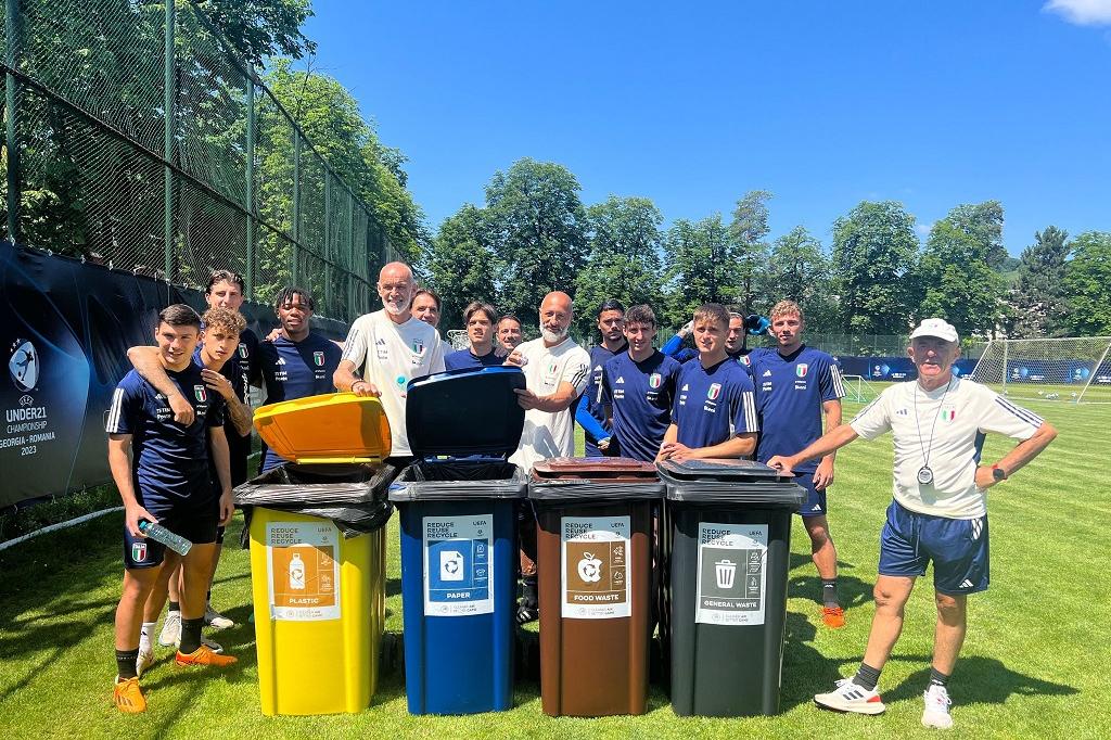 All’indomani del secondo match del girone, che ieri l’ha vista battere 3-2 la Svizzera, la Nazionale Under 21 ha posato in gruppo sul campo dell’UBB Training Center di Cluj-Napoca accanto ad alcuni contenitori per la raccolta differenziata. Uno scatto, quello realizzato prima della seduta di allenamento mattutina, volto a promuovere 'Cleaner Air, Better Game', la campagna lanciata dalla UEFA in occasione del Campionato Europeo di Georgia e Romania e a cui la FIGC ha aderito con l’obiettivo di sensibilizzare l'opinione pubblica sugli effetti dannosi dell'inquinamento atmosferico sulla salute pubblica.