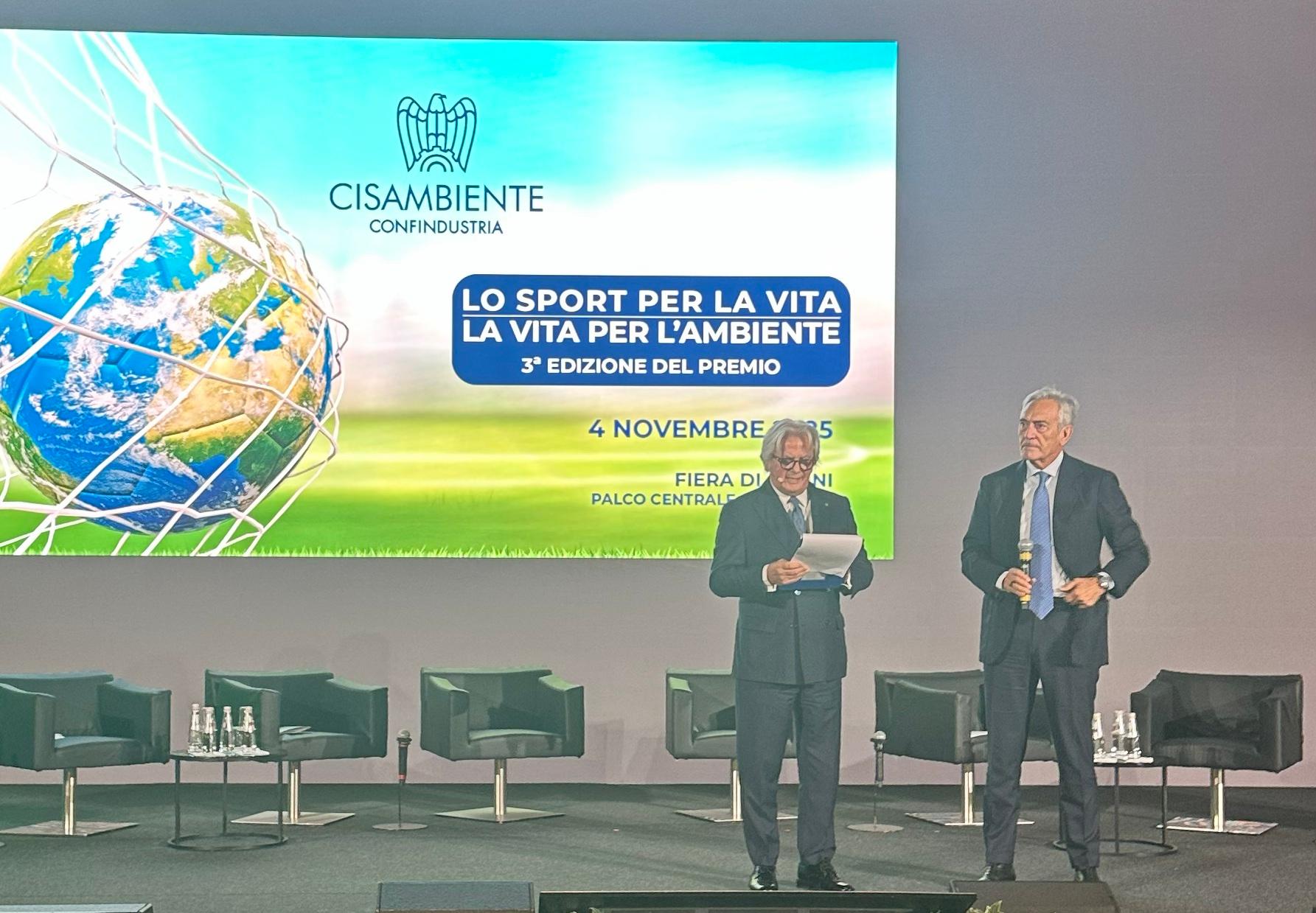 Al presidente della FIGC Gabriele Gravina, in occasione della giornata inaugurale di Ecomondo 2025 – evento annuale leader nei settori della green and circular economy, nonché punto di incontro tra industrie, stakeholder, policy maker, opinion leader, mondo della ricerca e delle istituzioni – è stato consegnato uno dei tre prestigiosi riconoscimenti nell’ambito della 3ª Edizione del Premio ‘Lo Sport per la Vita - la Vita per l’Ambiente’ di Cisambiente Confindustria consegnatogli direttamente da Silvano Martinotti, Presidente di ‘Sport e Ambiente’ dell’Associazione.