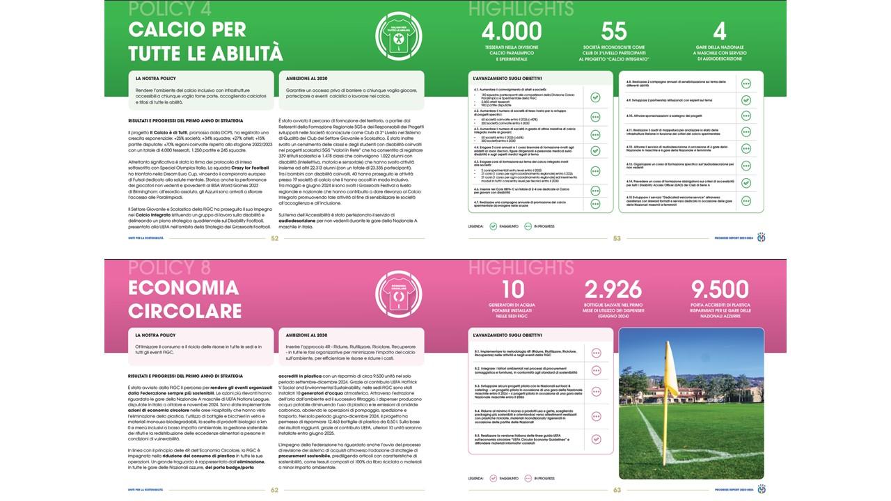 Il Progress Report FIGC 2023-2024 sulla Sostenibilità Sociale e Ambientale rappresenta una best practice in ambito di reporting. La FIGC è la prima Federazione sportiva italiana ad aver redatto una Strategia di Sostenibilità Sociale e Ambientale e la prima realtà sportiva italiana ad aver implementato un sistema di reporting, replicabile a tutti i livelli dell’ecosistema calcistico e anche da parte di altre Federazioni Sportive, per rendicontare gli obiettivi ESG (Environment, Social and Governance) i KPI (Key Performance Indicator) e i risultati raggiunti.