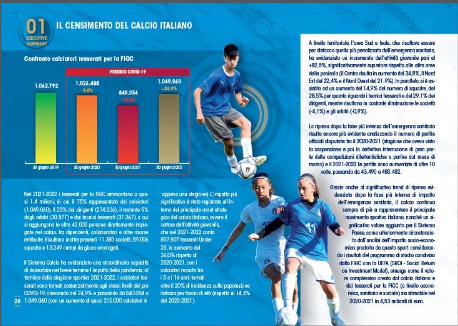 Considerando la dimensione sportiva, i tesserati per la FIGC nel 2021-2022 ammontano a quasi 1,4 milioni (la Federcalcio rappresenterebbe oggi il terzo "comune" in Italia in termini di popolazione): il Sistema Calcio ha evidenziato una straordinaria capacità di riassorbire nel breve termine l’impatto della pandemia; i calciatori tesserati sono tornati sostanzialmente agli stessi livelli del pre COVID-19, crescendo del 24,9%, con un aumento di quasi 210.000 giocatori in appena una stagione (dagli 840.054 del 2020-2021 ai 1.049.060 del 2021-2022).