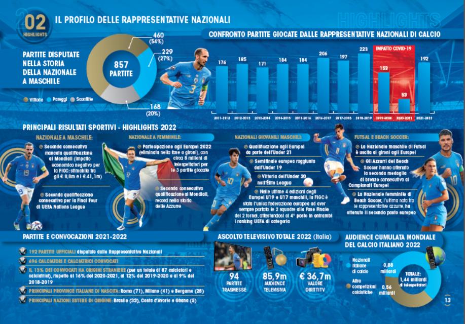 Nel 2021-2022 le Nazionali hanno giocato 192 partite (con 696 calciatori e calciatrici convocati), dato in significativo aumento rispetto alle 2 stagioni precedenti (53 nel 2020-2021 e 153 nel 2019-2020), fortemente impattate dal COVID-19.