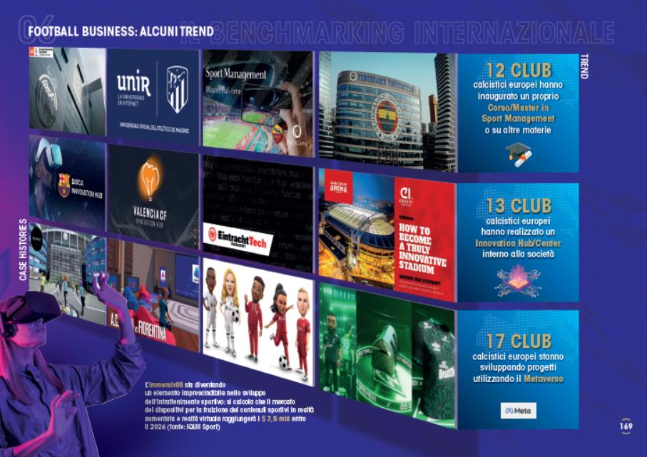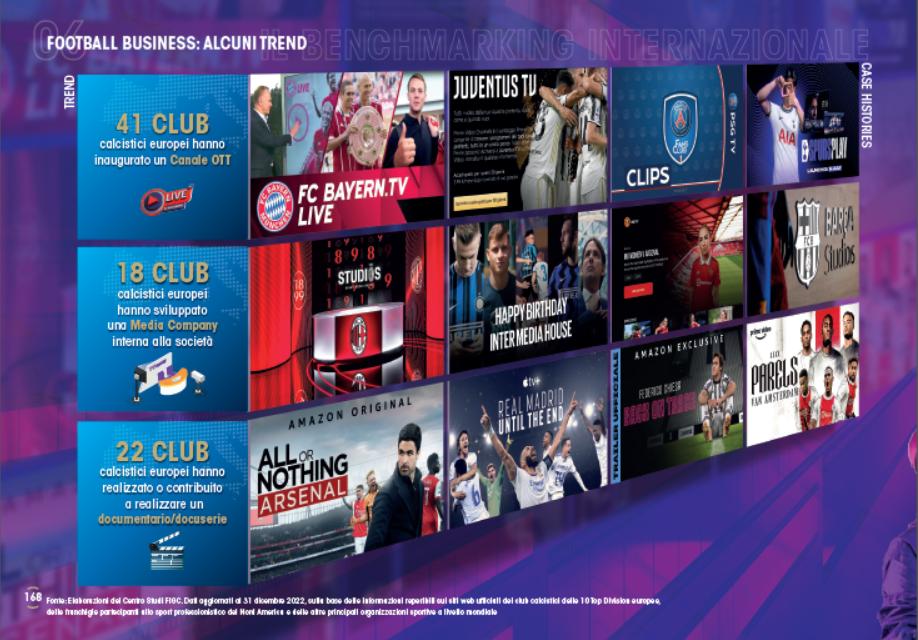 Il ReportCalcio 2023 analizza anche il profilo relativo ai 181 club partecipanti alle 10 principali Top Division europee (Inghilterra, Germania, Spagna, Italia, Francia, Olanda, Portogallo, Turchia, Russia e Scozia); a livello digitale, il numero di fan e follower sui principali social network (Facebook, Twitter, Instagram e TikTok) è arrivato a sfiorare nel 2022 i 2,6 miliardi, con 19,9 miliardi di visualizzazioni su YouTube; dal punto di vista commerciale, si contano 3.886 accordi di sponsorizzazione, di cui il 26% di provenienza estera, mentre i settori merceologici più rappresentati sono quelli relativi a Servizi & Consulenza (442 sponsorizzazioni), Abbigliamento & Moda (360) e Bevande (325). Si contano inoltre 228 sponsorizzazioni di maglia (il principale settore merceologico rimane quello relativo al Betting, con il 17%) e 62 stadium naming rights (di cui il 24% sottoscritti da aziende provenienti dal settore "Bancario, Assicurativo & Servizi Finanziari"). Per quanto riguarda gli altri principali trend a cui si è assistito nel periodo più recente, 143 club dispongono di una divisione di e-sports nel 2022 (rispetto alle 67 del 2017), 41 società hanno lanciato un proprio canale OTT, 22 società hanno realizzato o contribuito a realizzare una docuserie sulla propria attività, 17 club stanno sviluppando progetti utilizzando il Metaverso e 13 hanno aperto un Innovation Center, mentre 12 società hanno inaugurato un proprio Master o Corso in Sport Management, 30 hanno lanciato un Fan Token e 45 hanno avviato progetti e collaborazioni in ambito NFT.