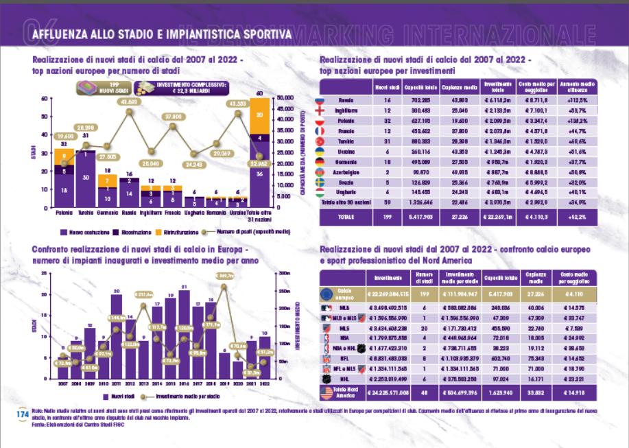 L’avvio di un programma di investimento per la realizzazione di una nuova generazione di impianti calcistici nel nostro Paese appare sempre più imprescindibile, al fine di accorciare il sempre crescente gap accumulato con le principali realtà internazionali: negli ultimi 16 anni (2007-2022) in Europa sono stati realizzati un totale di 199 nuovi impianti, con un investimento pari a 22,3 miliardi di euro; le principali nazioni in termini di nuovi stadi sono Polonia e Turchia (oltre 30 nuovi impianti), davanti alla Germania (18) e alla Russia (16). L'Italia con i 5 nuovi stadi inaugurati in questo periodo (Juventus, Udinese, Frosinone, Albinoleffe e Südtirol) ha intercettato solo una minima parte di questo potenziale, incidendo per appena l'1% degli investimenti totali prodotti in Europa.