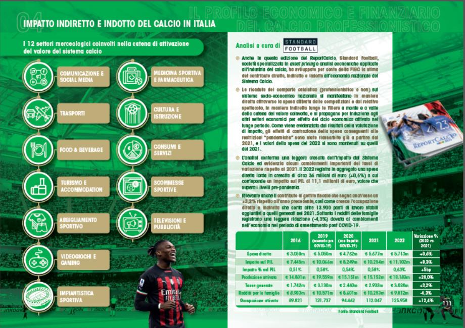L’attività calcistica costituisce inoltre un sempre più rilevante settore industriale del nostro Paese; i ricavi diretti totali ammontano a 5 miliardi di euro; considerando anche l’impatto indiretto e indotto prodotto sui 12 settori merceologici coinvolti nella catena di attivazione di valore del calcio, l’impatto sul PIL italiano è stimabile in oltre 11,1 miliardi di euro, con quasi 126.000 posti di lavoro attivati, mentre la contribuzione fiscale e previdenziale del calcio di vertice (Serie A, B e C) nel 2020 ha superato gli 1,3 miliardi di euro; i 99 club di calcio professionistico incidono per il 73,1% della contribuzione del comparto sportivo italiano (50.000 società ed enti), incidenza record tra quelle registrate dal 2015. Negli ultimi 15 anni analizzati, per ogni euro «investito» dal Governo italiano nel calcio, il Sistema Paese ha ottenuto un ritorno in termini fiscali e previdenziali pari a € 18,9, dato dal rapporto tra la contribuzione fiscale e previdenziale generata dal calcio professionistico italiano nel periodo considerato, pari ad oltre 16,8 miliardi di euro, e i contributi erogati da CONI / Sport e Salute alla FIGC nel medesimo arco di tempo, pari a 891,6 milioni.