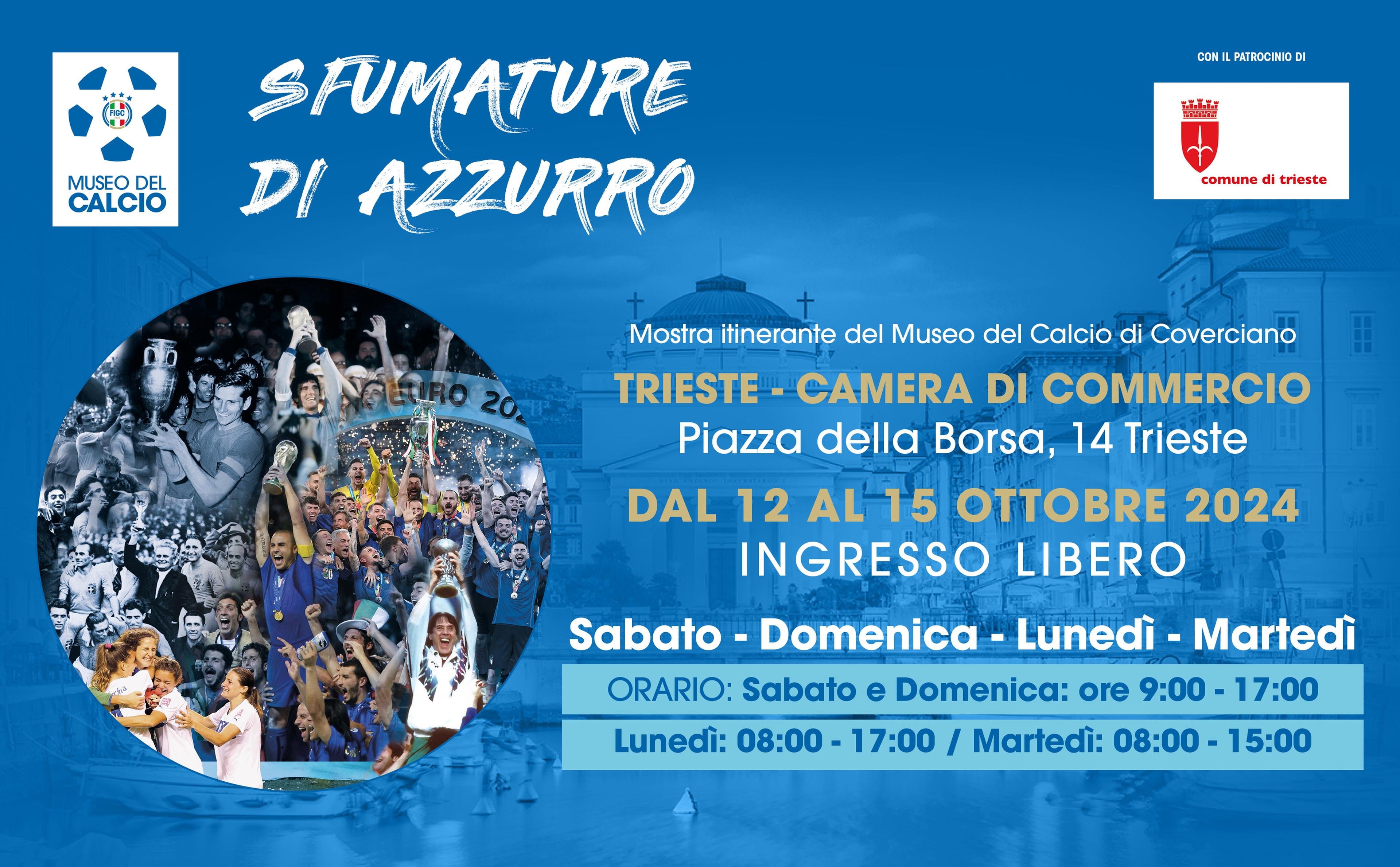 SFUMATURE DI AZZURRO Sarà la Camera di Commercio di Trieste a ospitare, da sabato 12 a martedì 15 ottobre, la nuova tappa della mostra itinerante ‘Sfumature di Azzurro’, con i cimeli del Museo del Calcio di Coverciano. Nei giorni che precederanno Italia-Irlanda, gara decisiva per la qualificazione all'Europeo Under 21, la possibilità per i visitatori - con ingresso libero - di ripercorrere la storia della Nazionale, in un cammino adornato da quattro titoli mondiali, due continentali e un oro olimpico, e l'opportunità di vedere da vicino le Coppe del Mondo e degli Europei alzate dagli Azzurri.