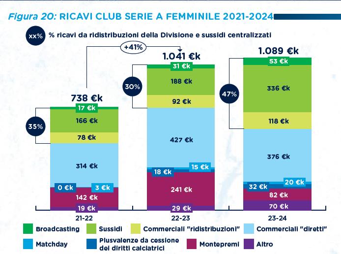 - Le ridistribuzioni dei ricavi raccolti centralmente della Divisione Serie A Femminile Professionistica e i sussidi federali/governativi sono aumentati del 94 % dalla stagione 2021-2022 alla stagione 2023-2024 e hanno raggiunto un peso pari al 47% rispetto al totale dei ricavi;